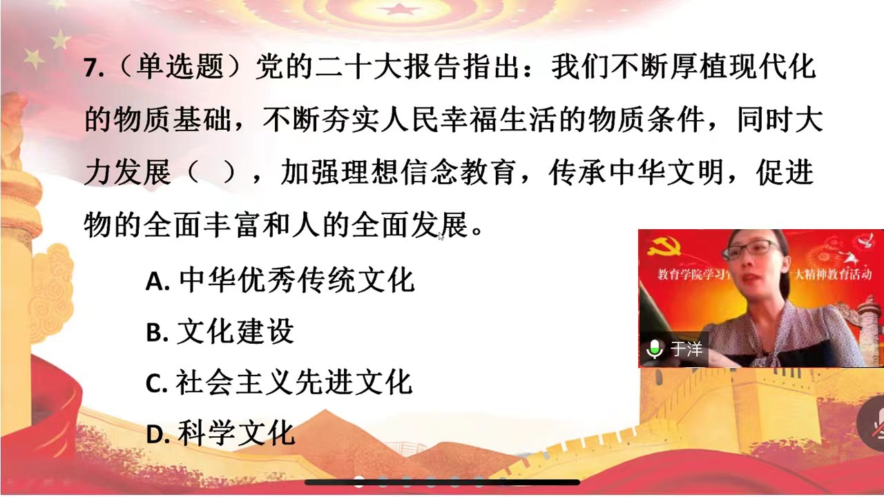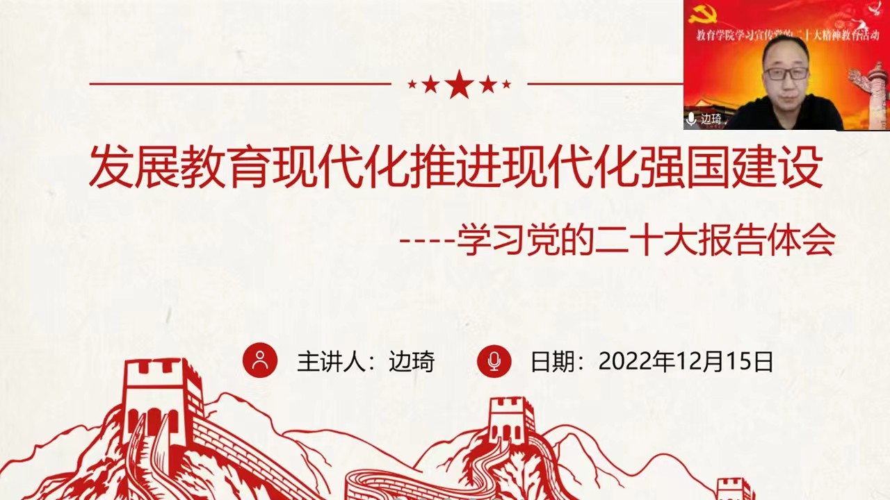 为深入贯彻学习党的二十大报告,把全院教职工的思想统一到党的二十大精神上,将教职工的力量凝聚到党的二十大确定的各项任务上,公司党委和工会在12月8日至12月17日举办了“学习宣传党的二十大精神教育活动”。本次活动的主题是“学习宣传贯彻党的二十大精神,凝心聚力,踔厉奋发,办好人民满意的高等教育”。受疫情影响,本次活动全程在线上进行,以“两集中、两分散”的学习方式展开。“两集中”是线上集中学习、线上集中竞答,“两分散”是居家分散学习、居家分散测试。居家分散学习、线上集中学习、线上集中竞答和居家分散测试四项活动相互融通、相互支撑,共同构成一个完整的学习单元。居家分散学习时间从12月8日起至12月14日止,期间活动筹备组定时向大家推送《党的二十大报告》全文、《中共中央关于认真学习宣传贯彻党的二十大精神的决定》等文件,并发送解读党的二十大精神的相关资料,要求教职工居家学习并深刻领会党的二十大精神。线上集中学习和集中竞答时间为12月15日下午3:00,在腾讯会议平台进行。在公司党委书记周越教授主持下,公司领导边琦副经理、赵荣辉副经理分别以《发展教育现代化推进现代化强国建设》、《加快建设教育强国、科技强国、人才强国》为题做了专题讲座,为教职工深入解读党的二十大精神。讲座结束后,于洋老师主持了学习宣传党的二十大精神网上集中竞答活动。会后,利用12月16日和12月17日两天时间,又通过微信小程序对全院教职工进行了居家分散测试答题活动,检验学习宣传党的二十大精神教育活动的效果。通过开展本次学习宣传党的二十大精神教育活动,必一运动全体教职工深入领会了党的二十大精神实质,为进一步贯彻落实党的二十大精神打下了坚实的思想基础。