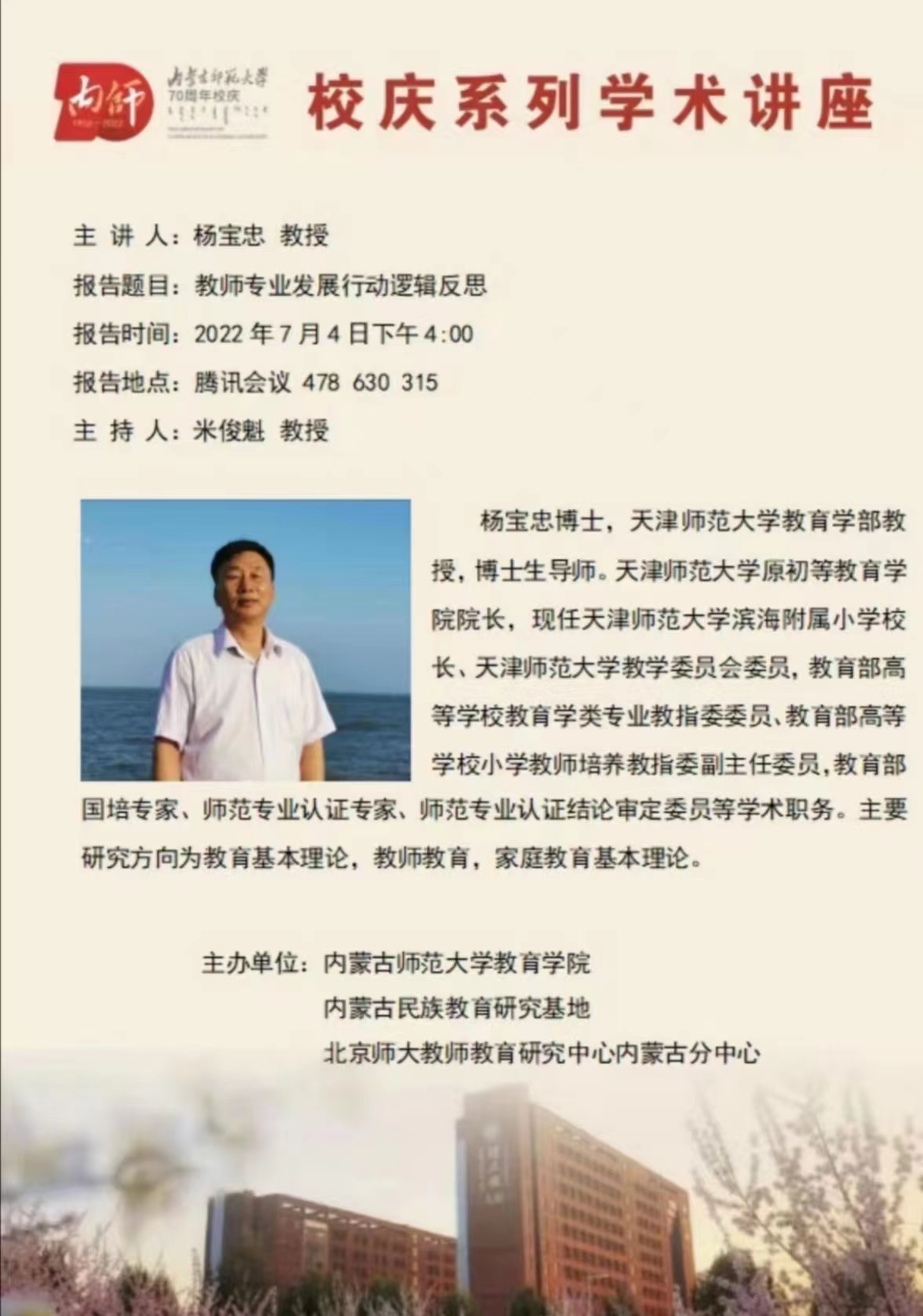 2022年7月4日,天津师范大学教育学部博士生导师、杨宝忠教授,通过腾讯视频会议,线上为必一运动全体师生,做了题为“教师专业发展行动逻辑反思”的学术报告。报告会由米俊魁经理主持,小学教育专业200多位师生聆听了学术报告。