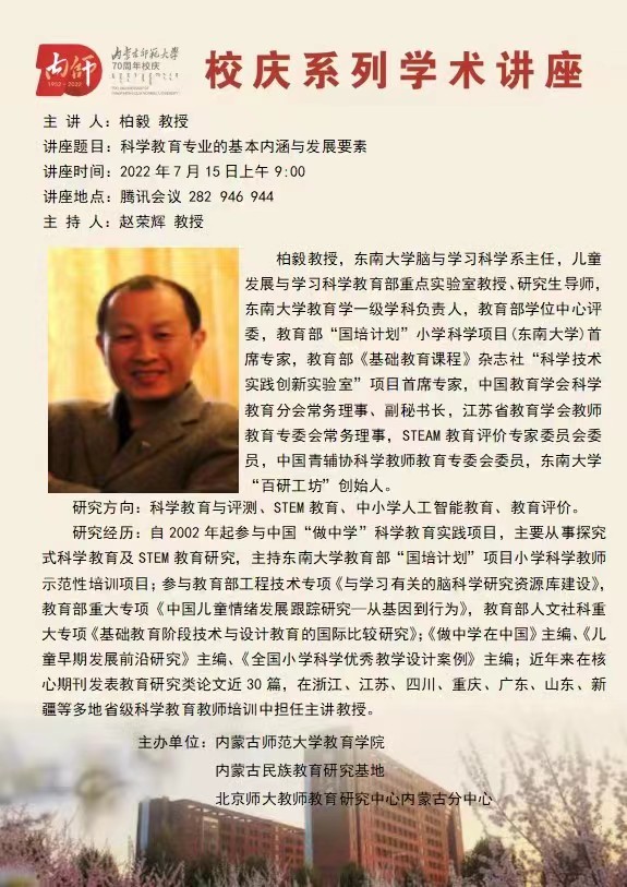 715日上午,公司邀请东南大学脑与学习科学系主任柏毅教授,为必一运动全体师生通过腾讯视频会议,做了题为“教育科学专业的基本内涵与发展要求”的学术报告。报告由必一运动、内蒙古民族教育基地、北师大教师教育研究中心内蒙古分中心主办,赵荣辉副经理主持,小学教育专业300多位师生聆听了报告。