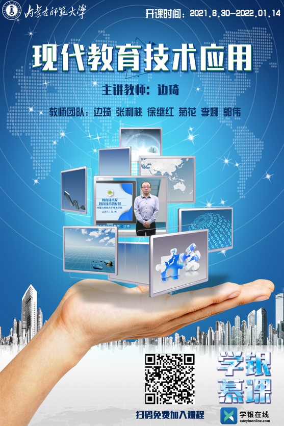 “现代教育技术应用”课程是面向师范生开设的一门必修课程,目前已成为内蒙古自治区一流开放课程,并在“学银在线”成功开设四期,以线上线下混合式开展教学。课程以《教育信息化2.0行动计划》和教师教育专业认证为背景,紧跟教育信息化发展,教与学的新理论、新技术和新环境的变化,以师范生教育技术能力的培养与提升为目标。本门课程旨在基础技术素养、技术支持教学、技术支持学习三个维度提升师范生的信息化教学技能。课程团队教师具有多年教学经验,持续改进提升课程质量。随着教育信息化的快速发展和社会对新时代教师的要求,教育技术能力已经成为教师必须具备的基本能力之一,是师范生培养和在职教师继续教育的必修内容。