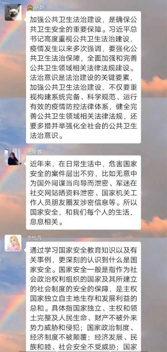 为深入学习贯彻以习近平同志为核心的党中央关于疫情防控工作的决策部署,引导员工将总体国家安全观贯穿抗疫全过程,履行应对突发公共事件的职责义务,提升维护国家安全的自觉性和主动性,公司各团支部举办以“深入认识公共卫生安全,增强国家安全意识”为主题的团日活动。通过线上交流、分享心得的方式,加强同学们对国家安全的认识,使国家安全教育深入到每个人心中。