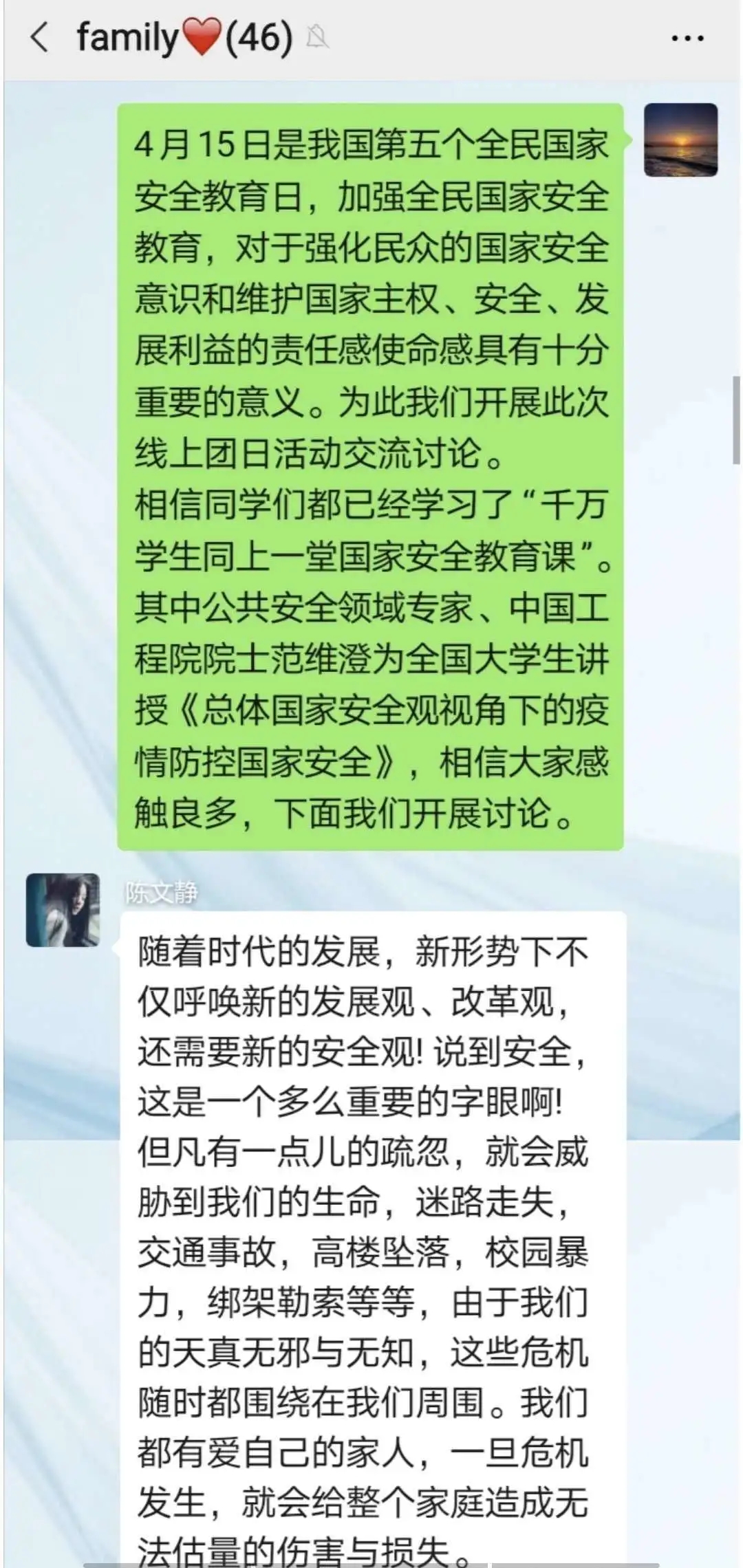 唯居安思危,方能思则有备,然有备无患。国家安全无小事,增强国家安全意识,切实维护国家安全是当代青年义不容辞的责任。家是最小国,国是千万家。我们要把总体国家安全观内化于心,外化于行,做国家安全的守护者,做维护国家安全践行人,齐心协力构筑起一道国家安全防线。