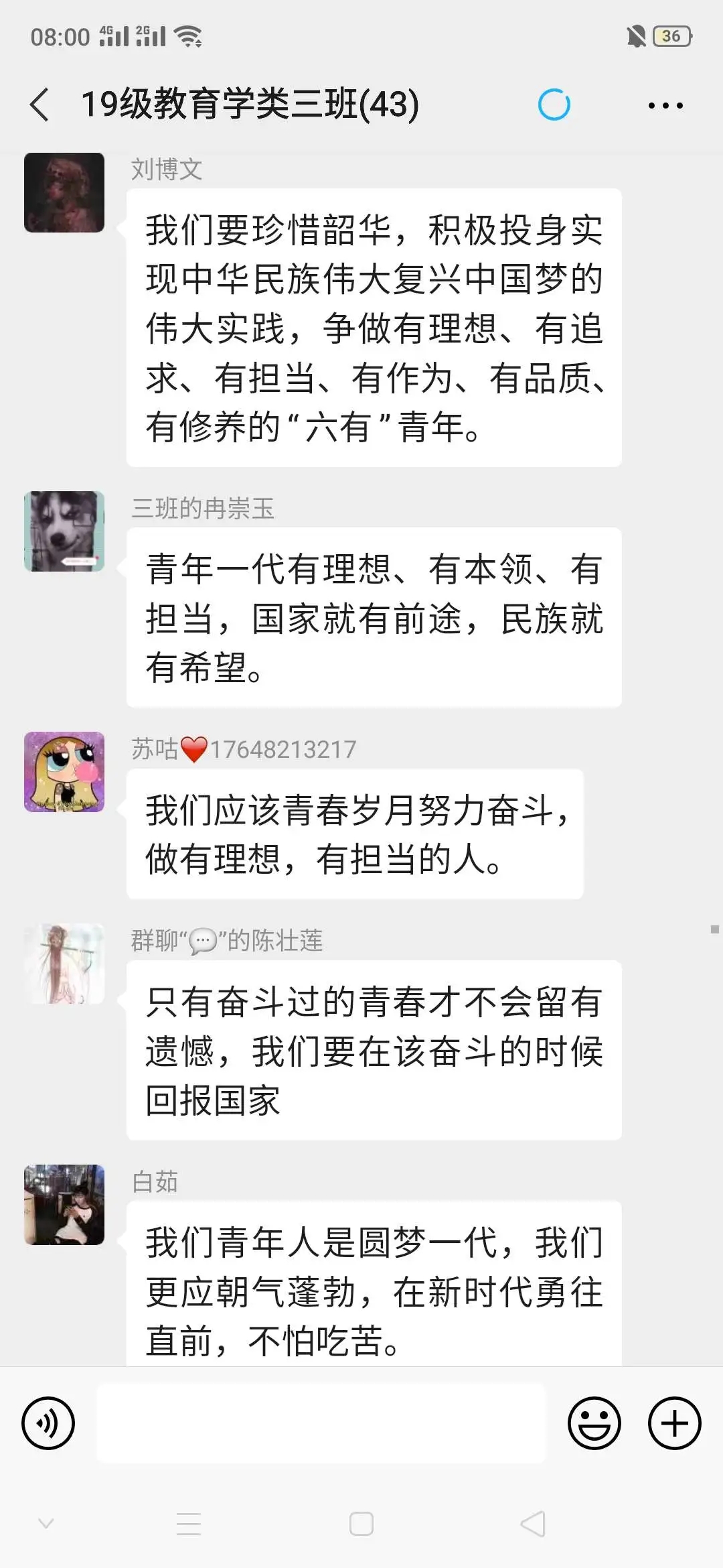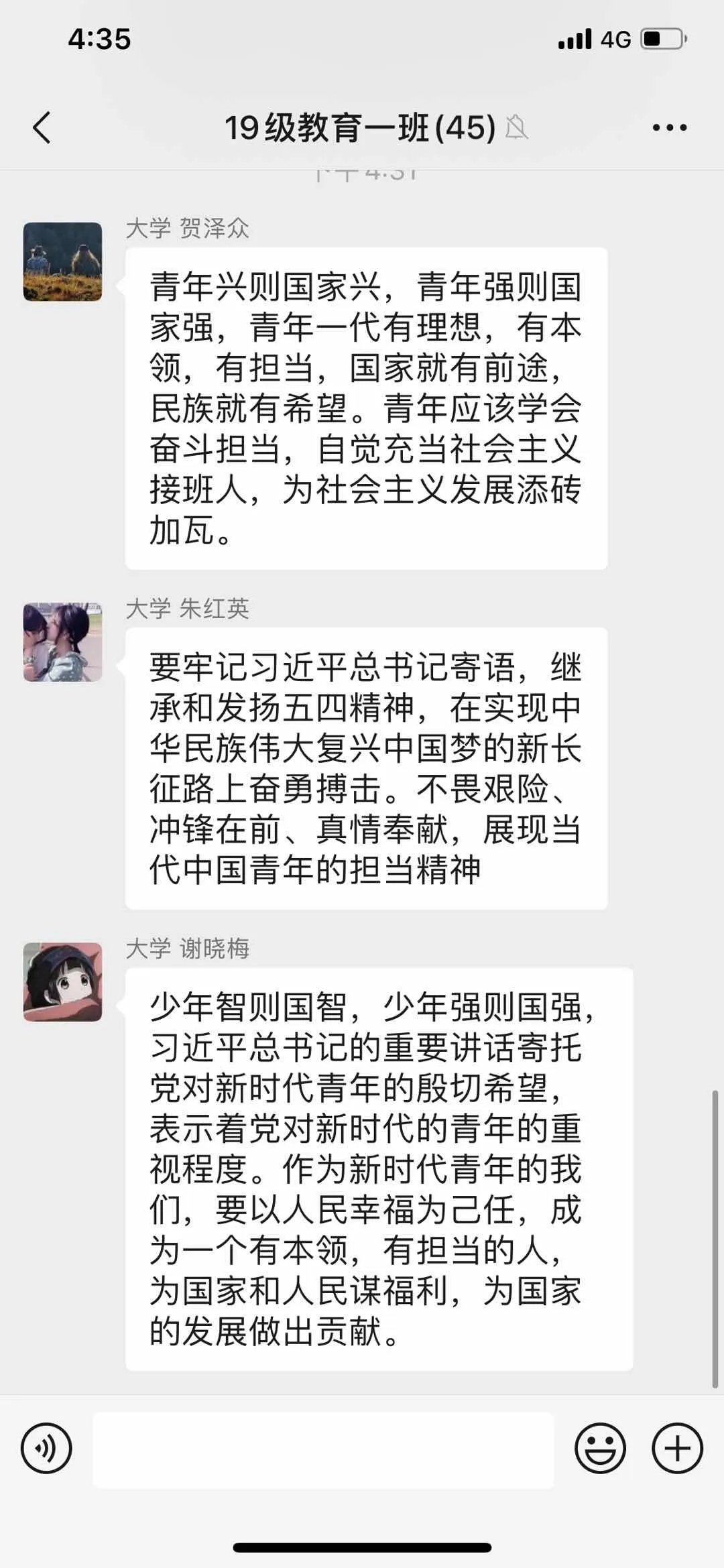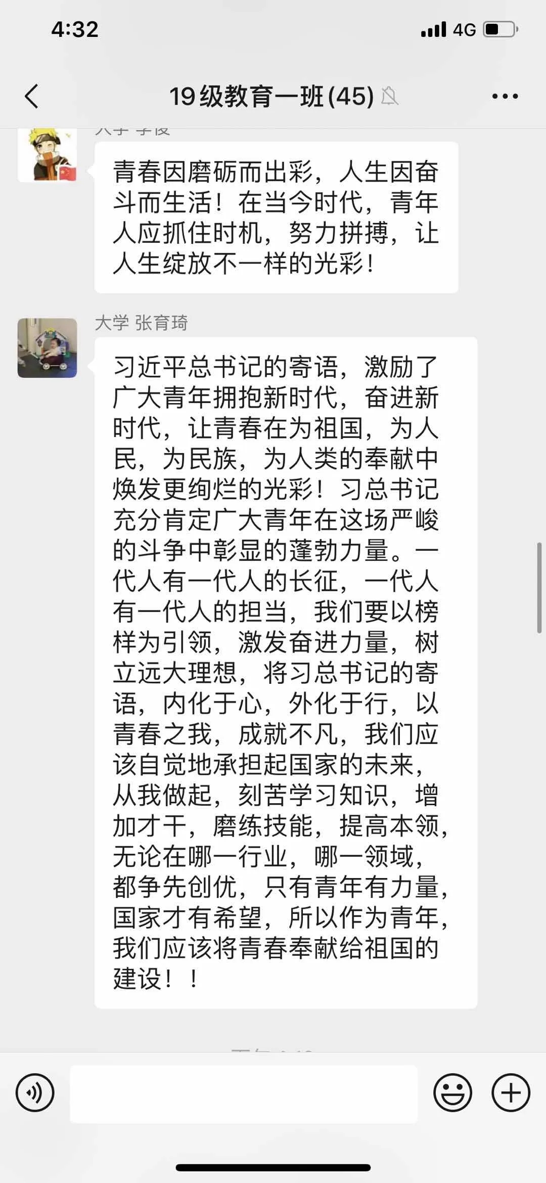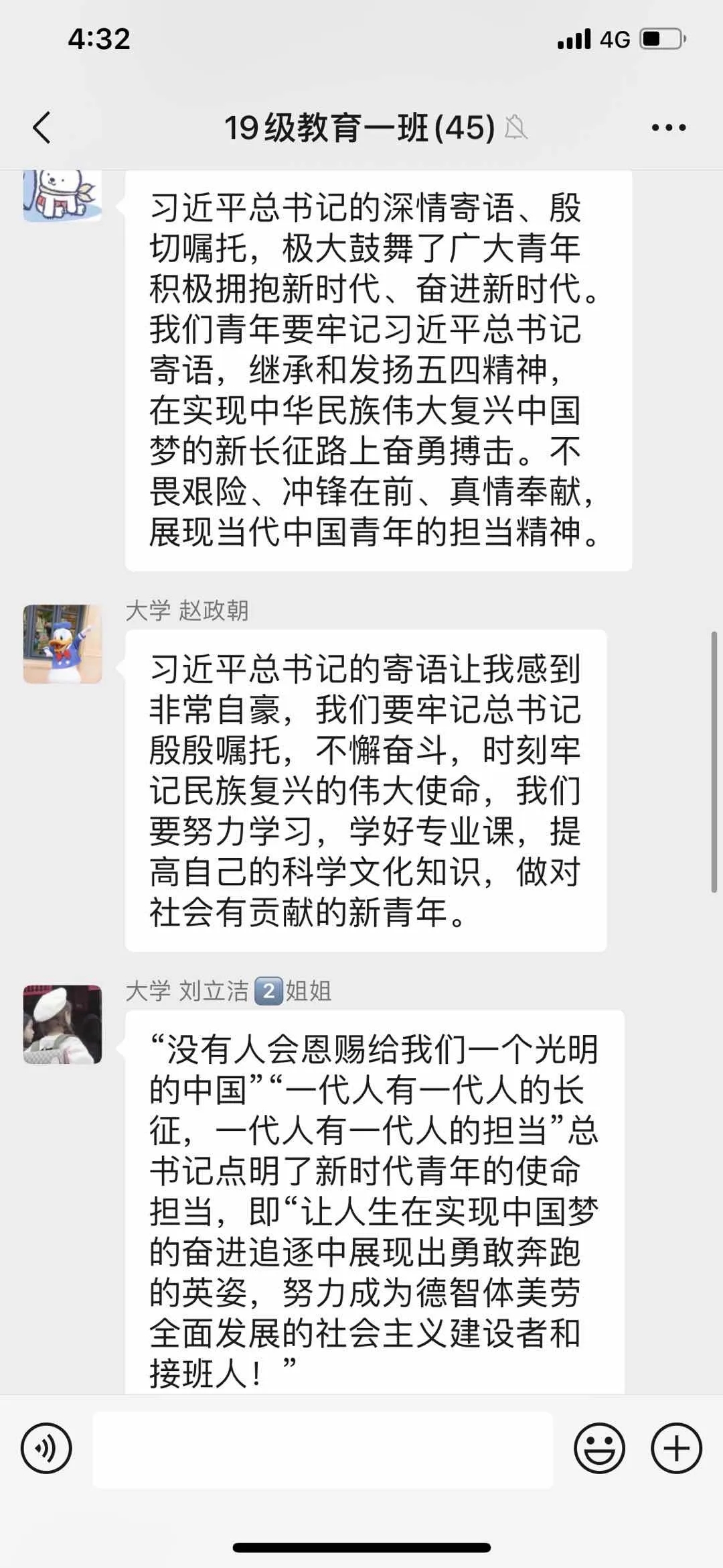 习近平总书记在5月3日寄语新时代青年,强调要坚定理想信念、站稳人民立场、练就过硬本领、投身强国伟业,向全国各族青年致以节日的祝贺和诚挚的问候。据此,必一运动组织开展学习近平总书记寄语精神的团日活动,通过交流分享、主题讨论等形式,让同学们贯彻学习近平总书记寄语,积极弘扬五四精神,激发同学们的学习动力、创造活力,坚定理想信念,真正理解“青春由磨砺而出彩,人生因奋斗而升华”。