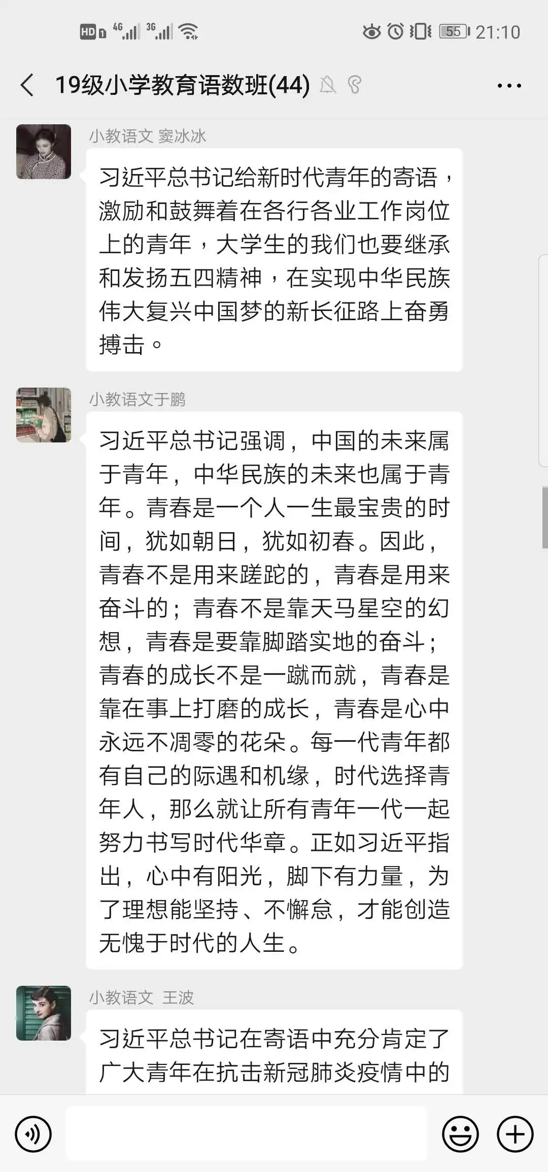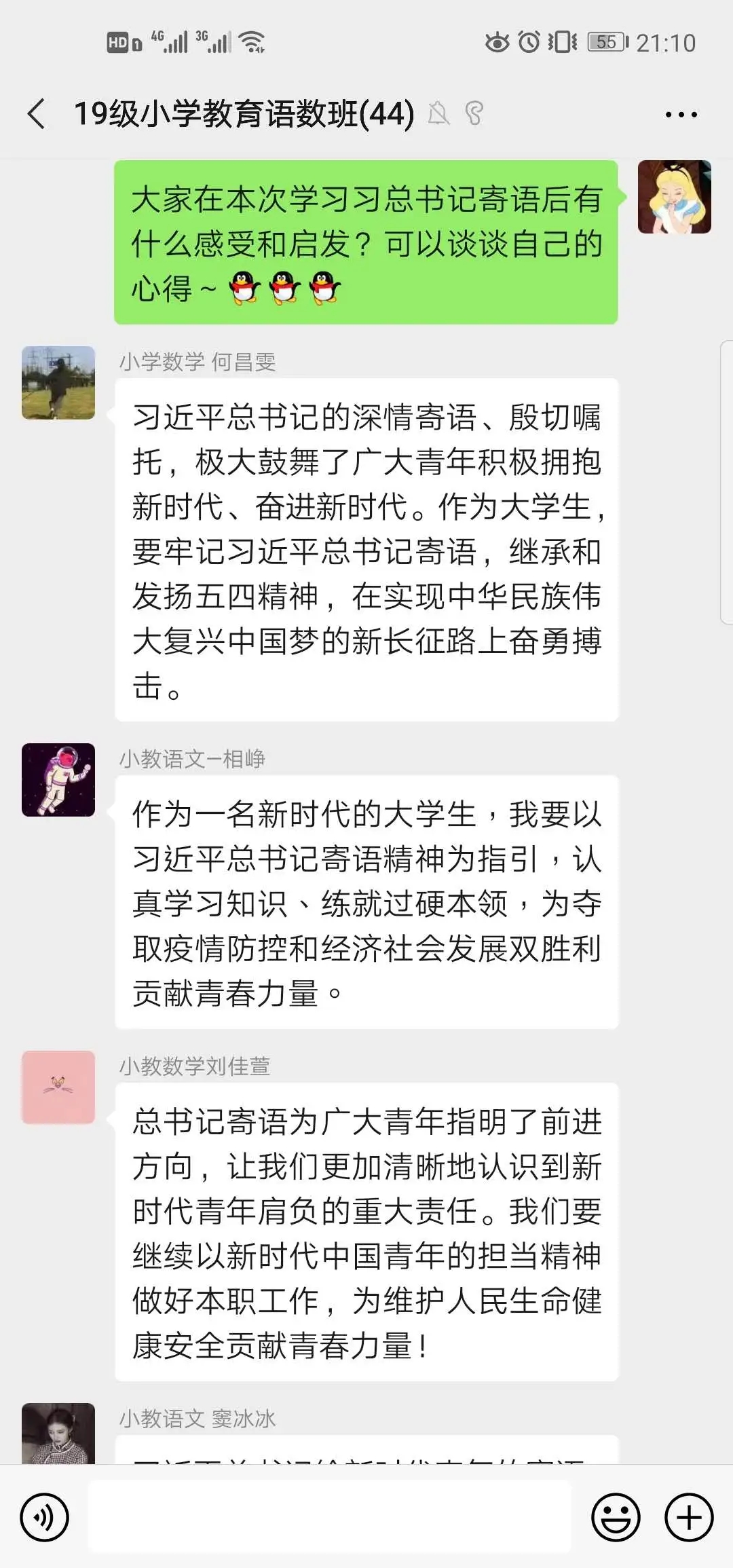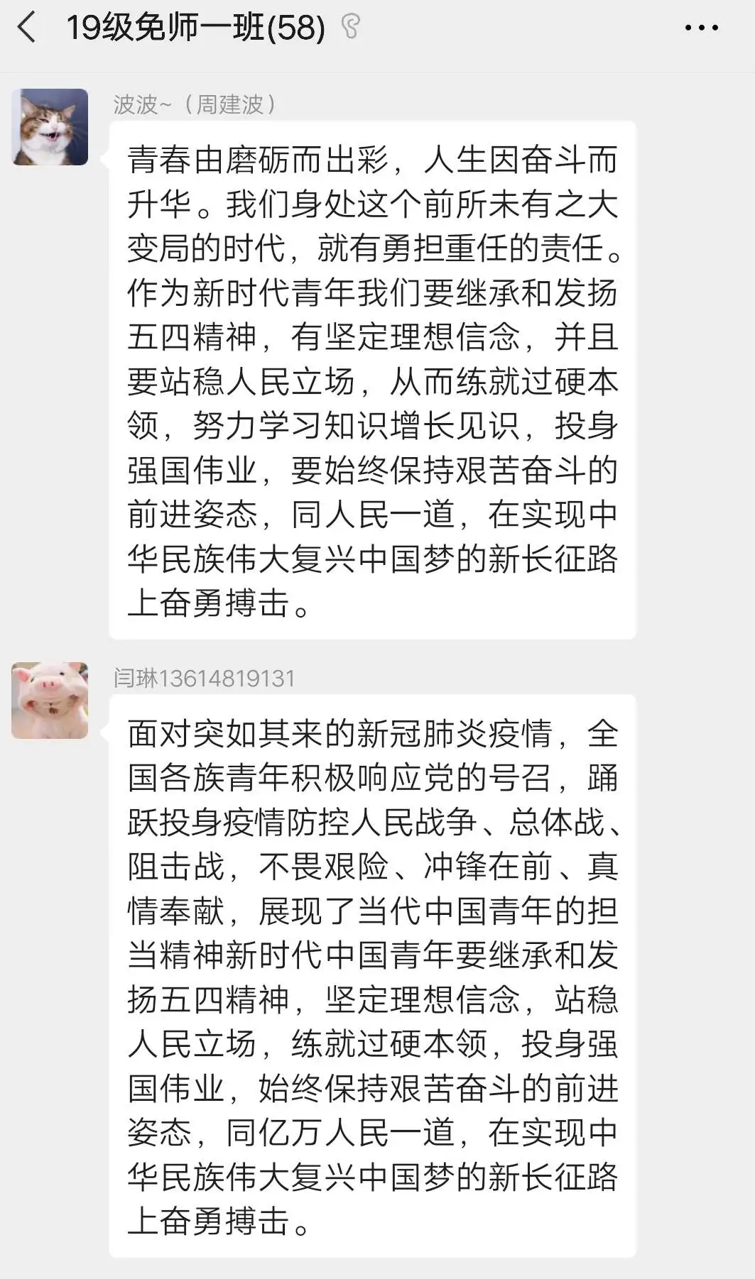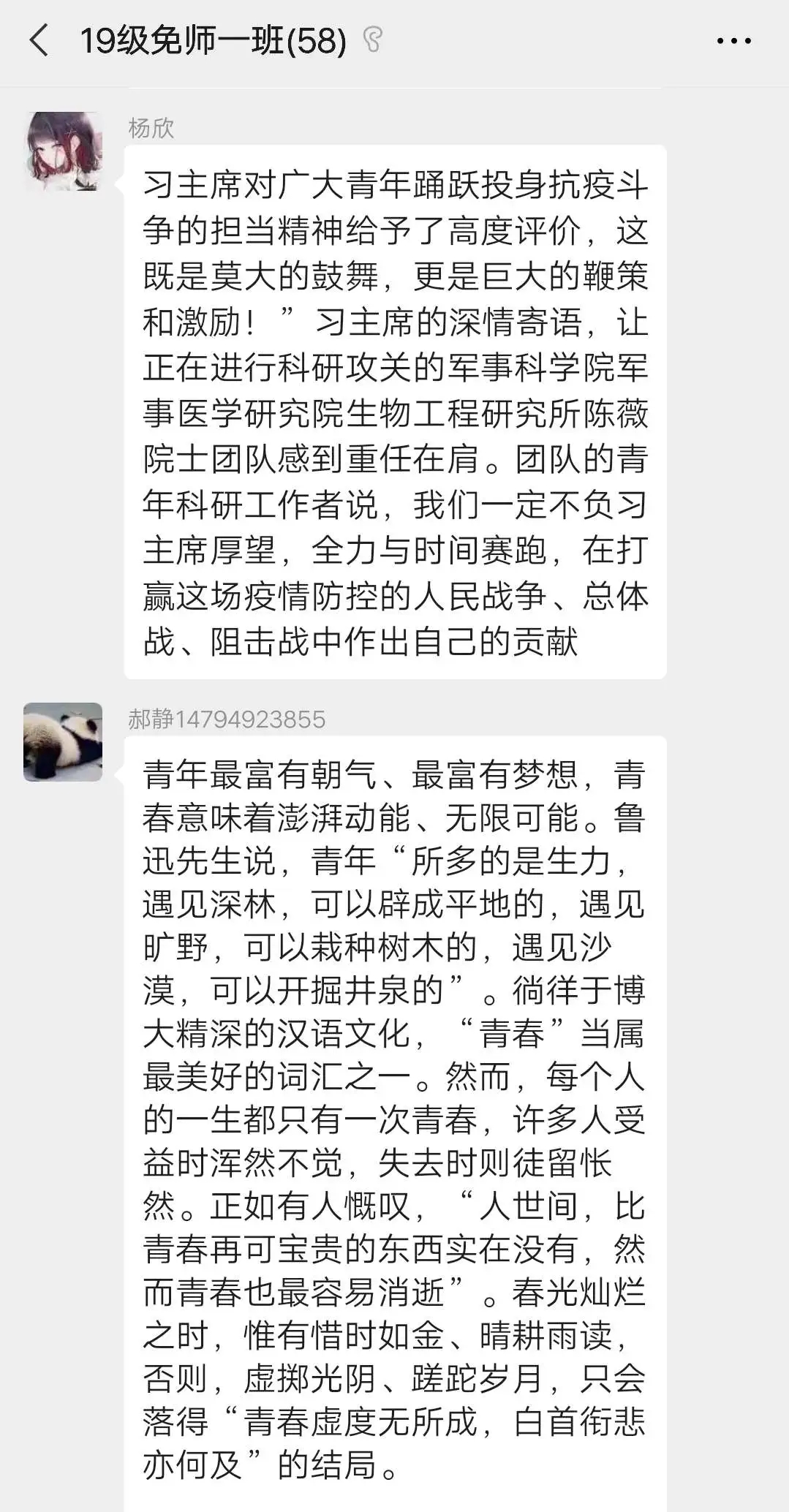 习近平总书记指出,青春由磨砺而出彩,人生因奋斗而升华。面对突如其来的新冠肺炎疫情,全国各族青年积极响应党的号召,踊跃投身疫情防控人民战争、总体战、阻击战,不畏艰险、冲锋在前、真情奉献,展现了当代中国青年的担当精神,赢得了党和人民高度赞誉。新时代中国青年要继承和发扬五四精神,坚定理想信念,站稳人民立场,练就过硬本领,投身强国伟业,始终保持艰苦奋斗的前进姿态,同亿万人民一道,在实现中华民族伟大复兴中国梦的新长征路上奋勇搏击。