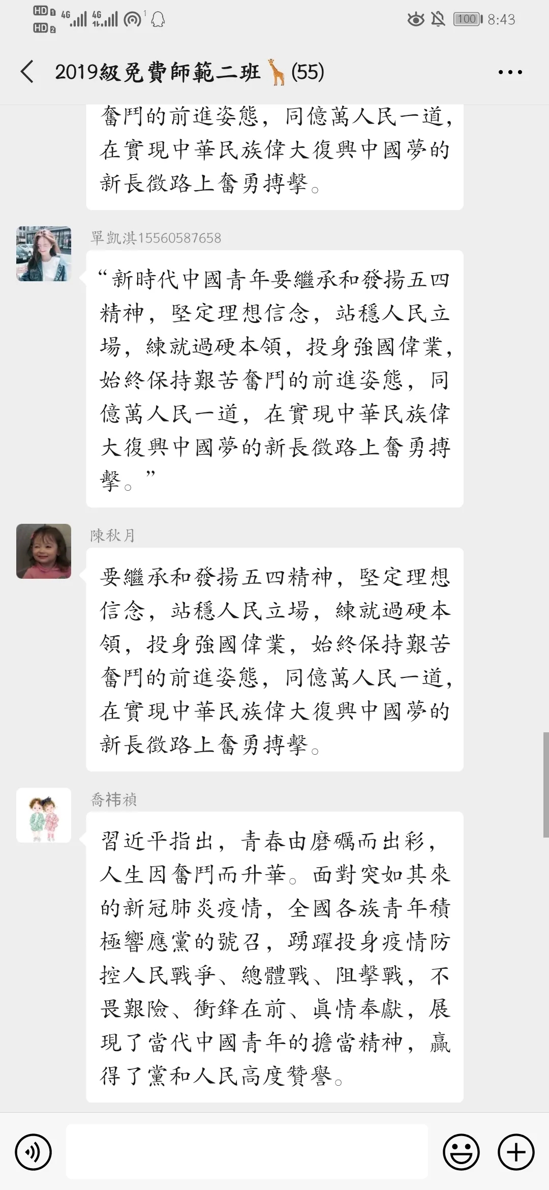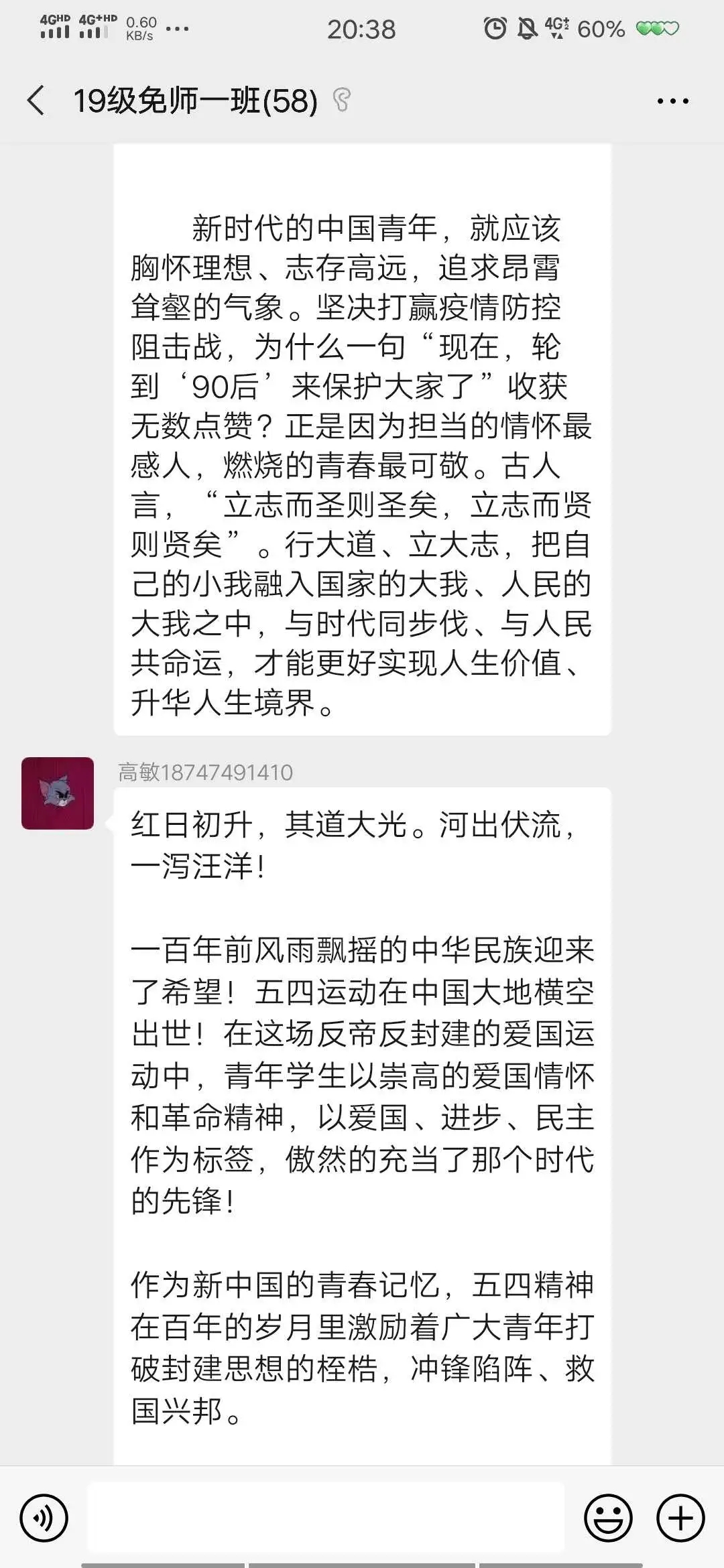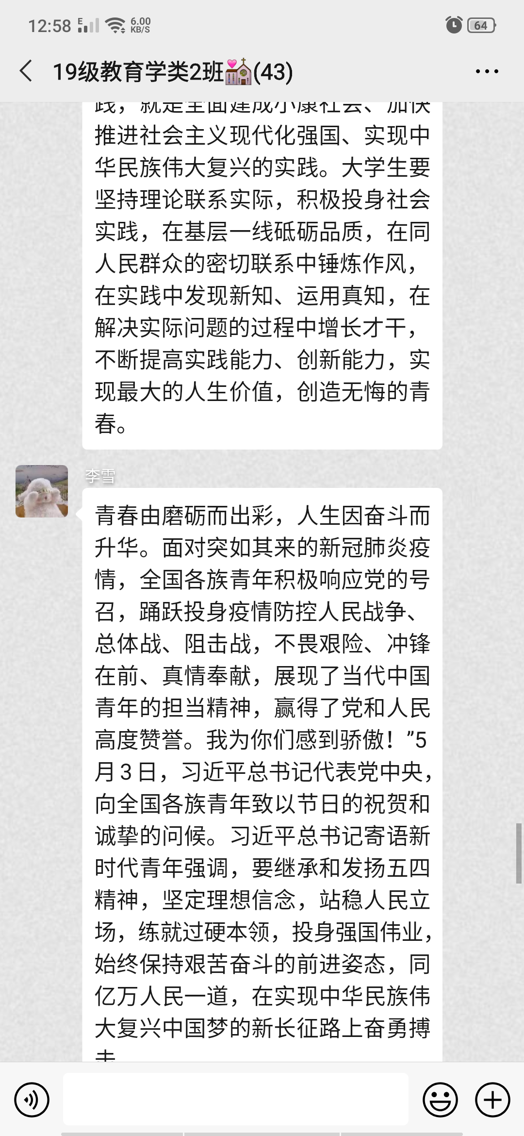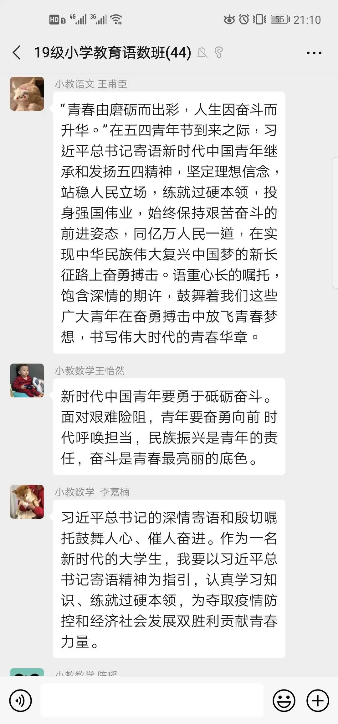 习近平总书记指出,青春由磨砺而出彩,人生因奋斗而升华。面对突如其来的新冠肺炎疫情,全国各族青年积极响应党的号召,踊跃投身疫情防控人民战争、总体战、阻击战,不畏艰险、冲锋在前、真情奉献,展现了当代中国青年的担当精神,赢得了党和人民高度赞誉。新时代中国青年要继承和发扬五四精神,坚定理想信念,站稳人民立场,练就过硬本领,投身强国伟业,始终保持艰苦奋斗的前进姿态,同亿万人民一道,在实现中华民族伟大复兴中国梦的新长征路上奋勇搏击。