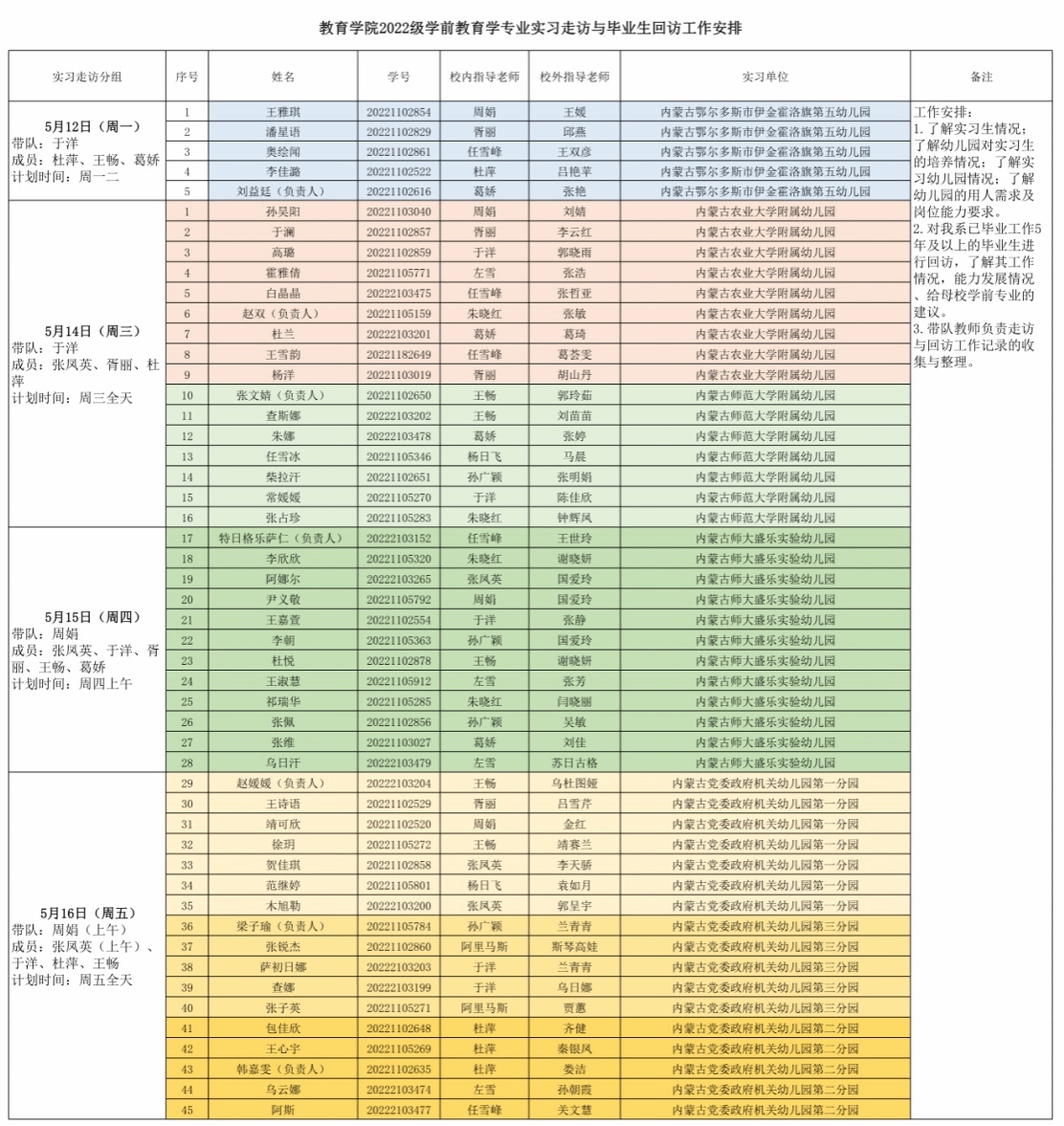 2025年5月11日至5月16日,学前教育系开展了本年度实习生走访与毕业回访工作。参与本次工作的教师队伍主要由中青年构成。