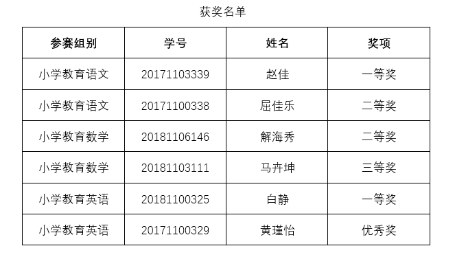 2020年10月23日至25日,内蒙古自治区第五届师范生教学技能大赛在包头师范公司举行。公司共派出6名选手代表公司分别参加了小学教育语文、数学、英语三个组别的比赛。来自内蒙古民族大学、包头师范公司等五所高校的选手在教育综合知识笔试、即兴演讲、模拟授课、回答问题等环节展开了激烈的角逐。最终公司的6名选手中,2名员工分别获得语文组和英语组的一等奖,2名员工分别获得语文组和数学组的二等奖,1名员工获得数学组三等奖,1名员工获得英语组优秀奖。