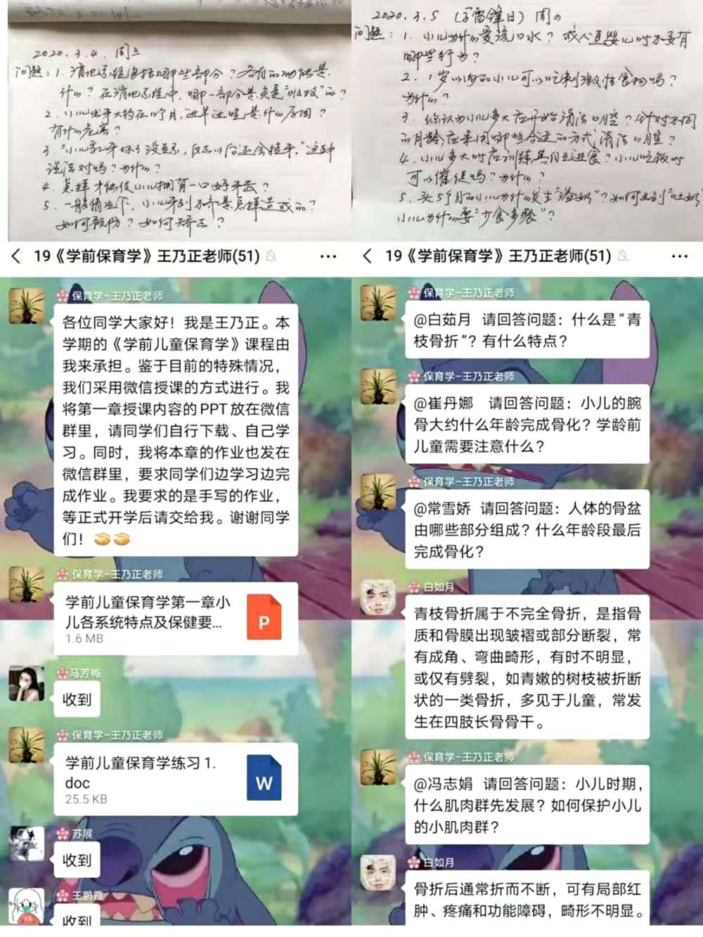 在公司敲定开学延迟通知之时,王老师和我就一直在沟通交流如何做好线上的教学,怎样保证同学们的学习质量,争取做到线上教学与线下自学同步,让同学们在家里也能掌握新知识。但是由于网上直播软件操作较为复杂,王老师操作有些困难。所以我们最后确定通过建立微信群,以群内提问、讨论的形式来开展我们的课堂教学。在微信群内,老师提供了参考资料PPT以及关于学前保育学的各种练习题,方便同学们学习和练习。