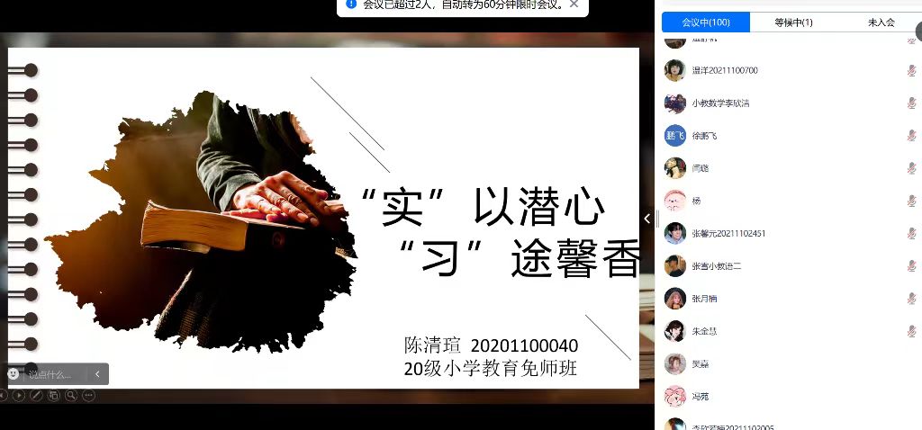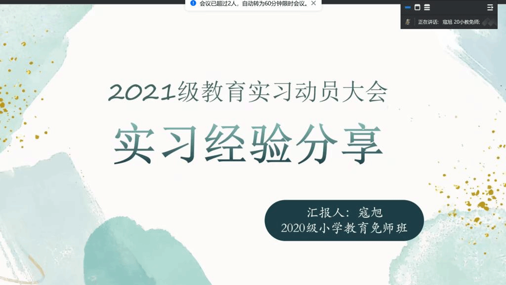 上学期刚刚结束实习的20级小学教育免师范班寇旭和陈清瑄两位同学分别就她们在区内和北京实习的经历进行了深入细致的经验分享。寇旭同学认为充分准备、积极沟通、善于思考对实习至关重。同时在工作中同学们既要切实担负起小员工的安全责任,也要明确自己的职责范围,听从校方及指导老师的安排。陈清瑄同学则提醒同学们反思总结应当与实习同步进行,切勿拖延。同时指出真诚是人际交往的法宝。