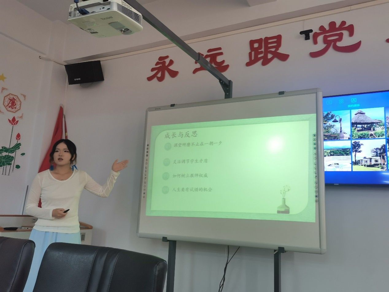 其次,实习生分别从课堂教学、班级管理、专业技能提升等方面进行了实习汇报。汇报过程中,小教语文班代苏雅整体介绍了公司概况,其后每位实习生进一步分享了自己在实习期间的感悟与成长。针对同学们遇到的共性问题:班级管理中,难以树立教师威严;教学过程中,重难点难以落实,马老师针对性地进行了指导,同时勉励大家,初到一线,遇到多样的问题在所难免,应继续保持饱满的精神状态,力争在收官阶段有所突破。