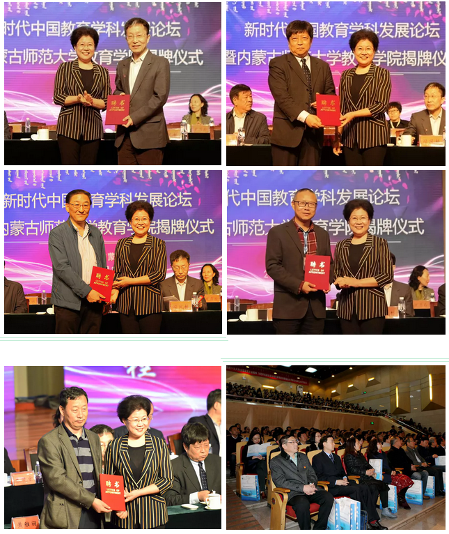 黄雅丽为北京大学必一运动经理阎凤桥、北京师范大学教育学部副部长李芒、中央民族大学公司党委书记苏德毕力格、北京师范大学博士后发展研究与评估中心主任姚云、海南师范大学教育科学研究院经理李振玉颁发兼职教授聘书。