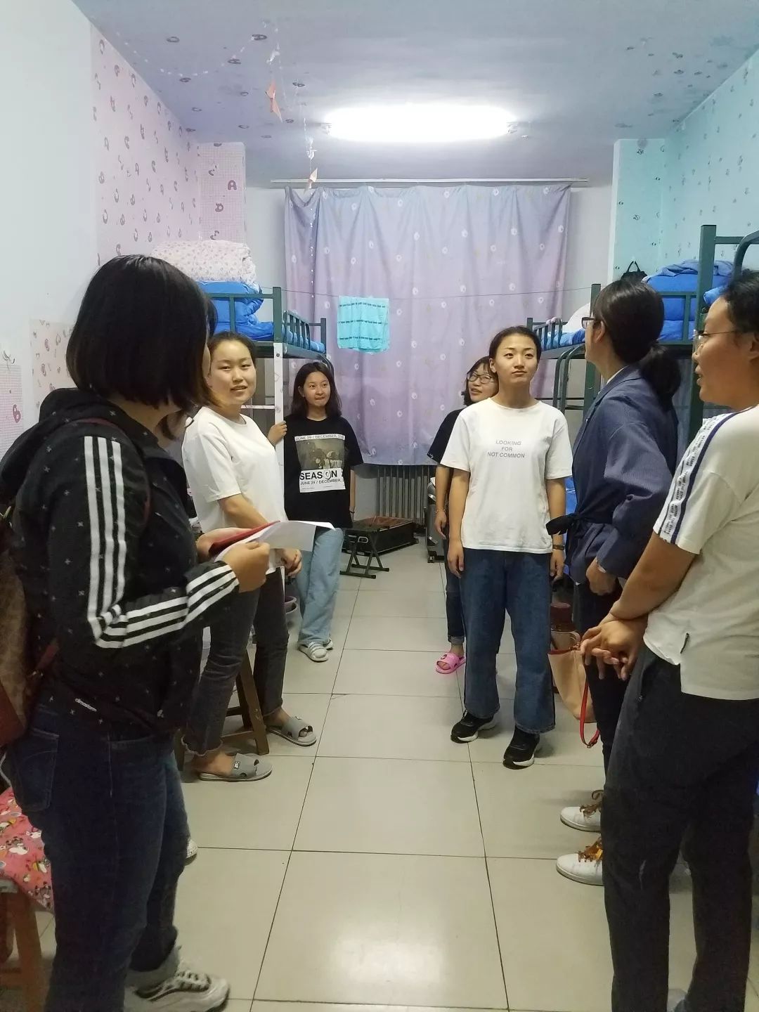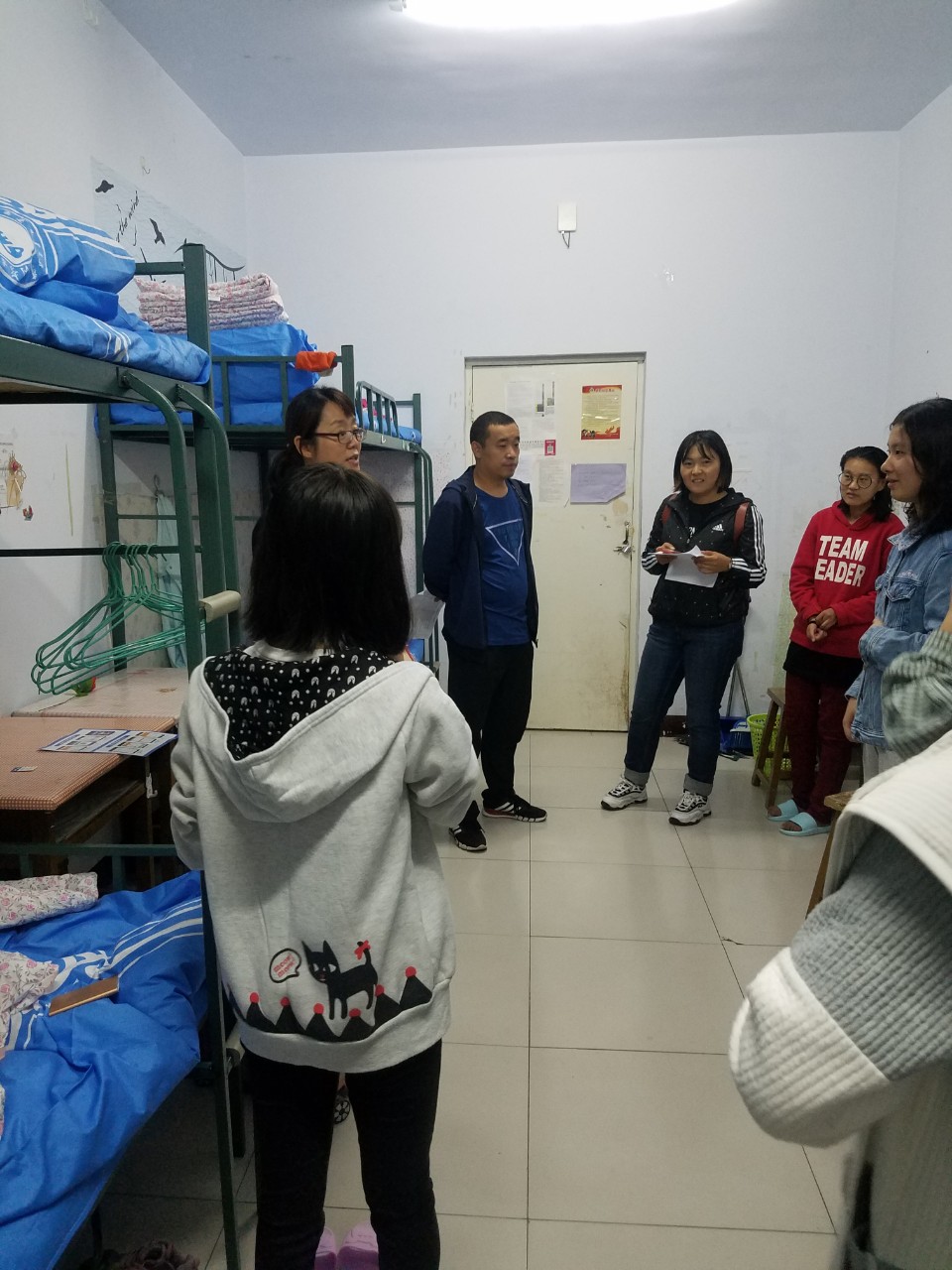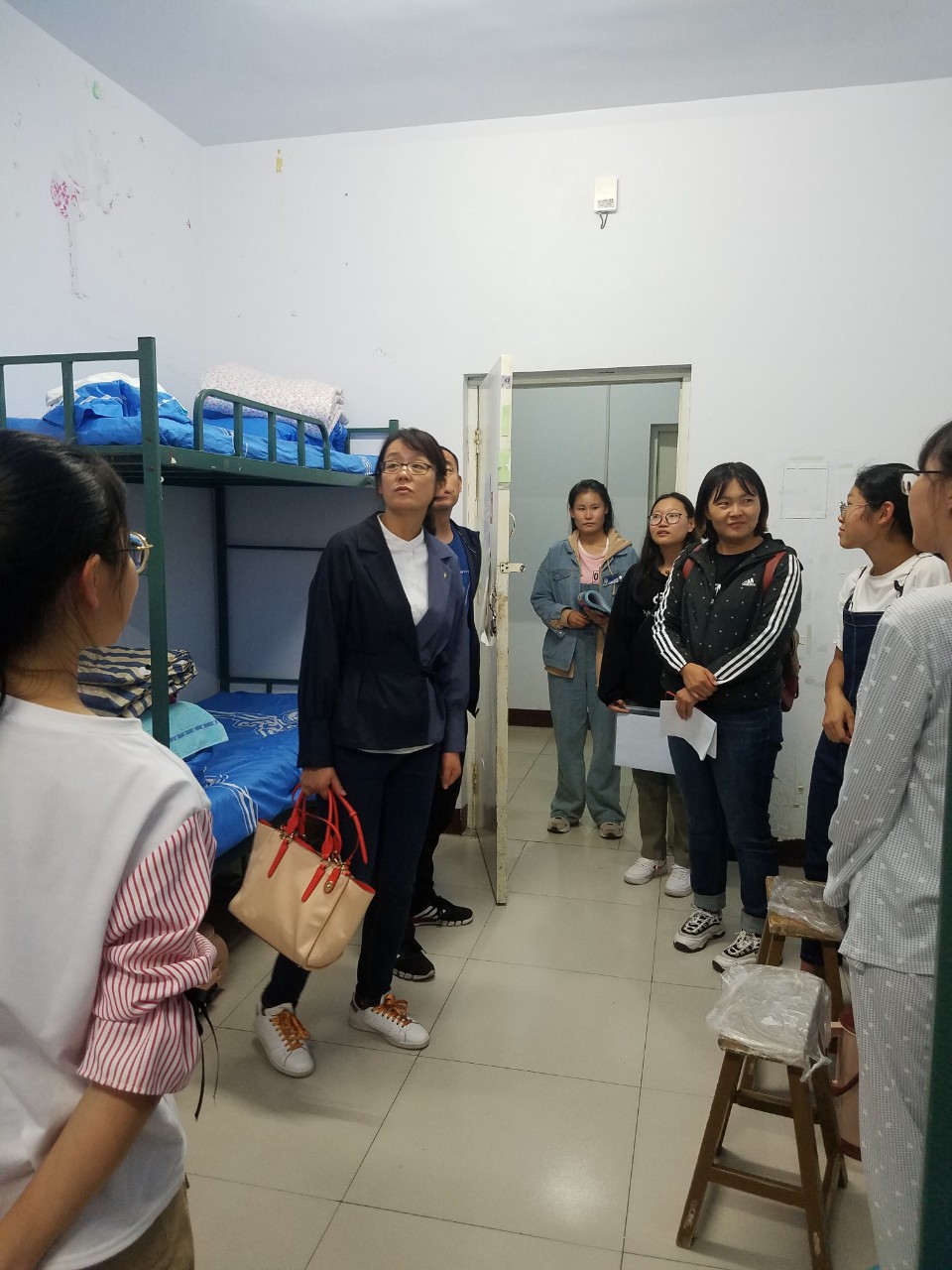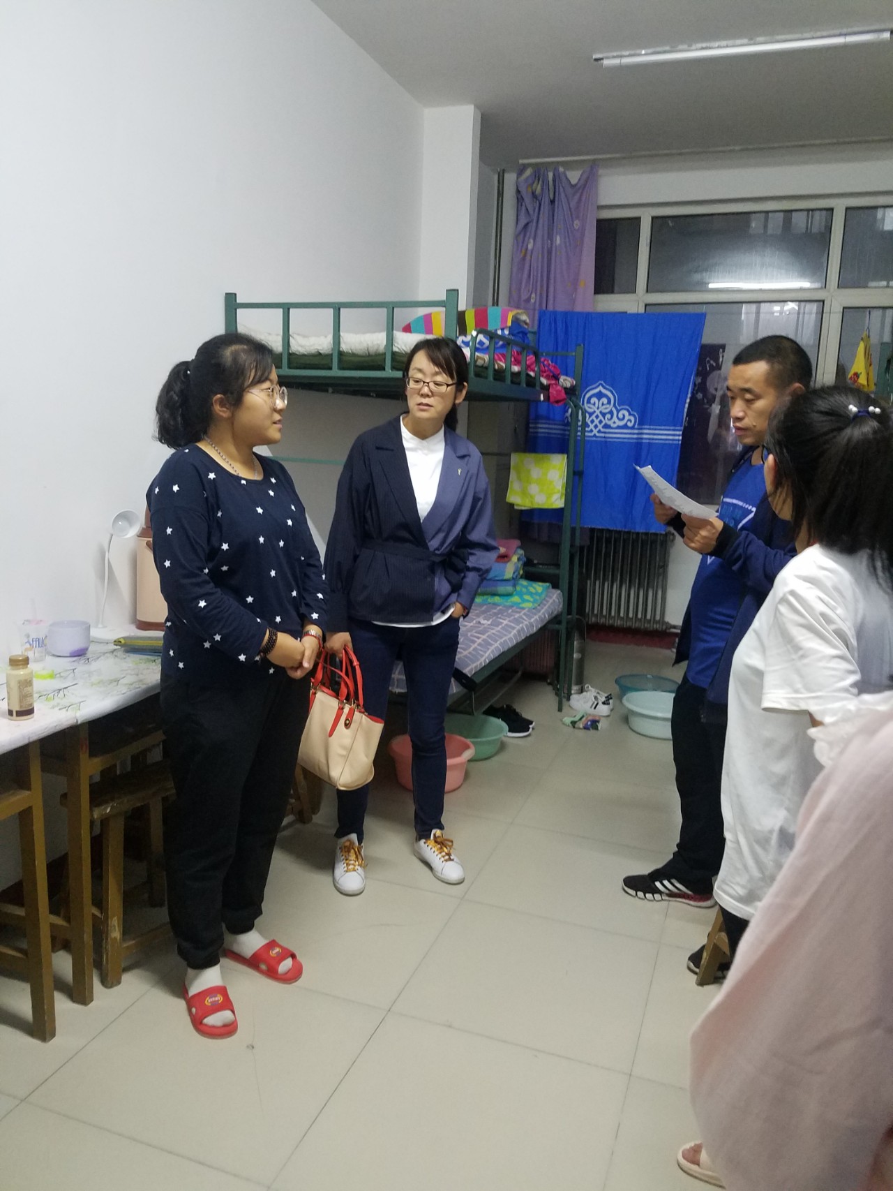 公司党委副书记兼副经理王利教授,学工办于国佳老师、团总支孙悦老师、辅导员张玉老师、苏日娜老师以及部分员工干部走进新生宿舍。
