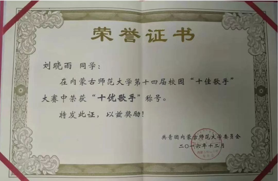 刘晓雨是一个多才多艺的女孩,自己也喜欢写歌,担任我们班的文艺委员,主要负责我们班的文艺活动,每次举办的都十分成功。挺佩服她的勇气,也很幸运晓雨去了仪仗队(据说当年内蒙只招收了5个),感觉她是我们的骄傲。