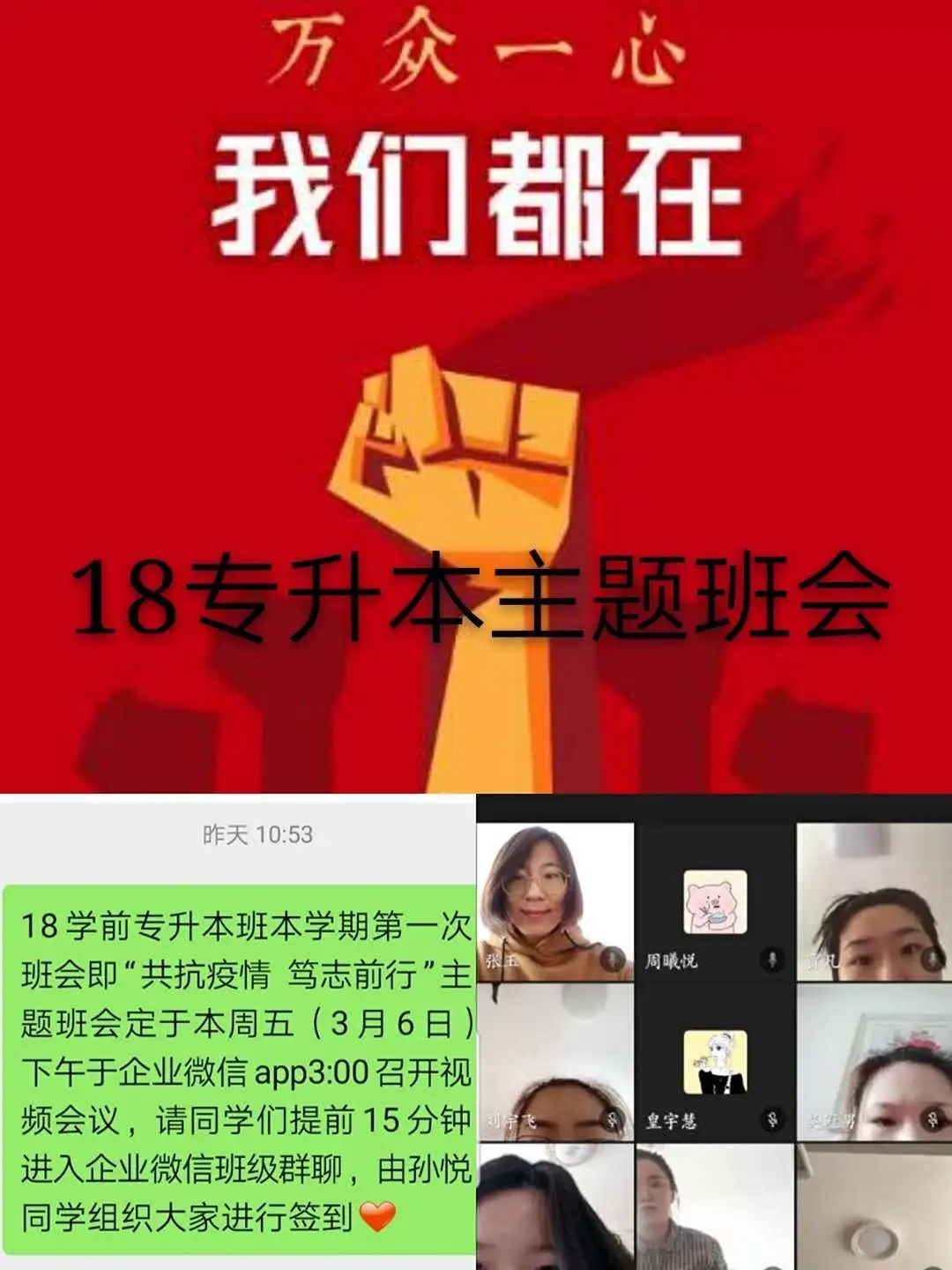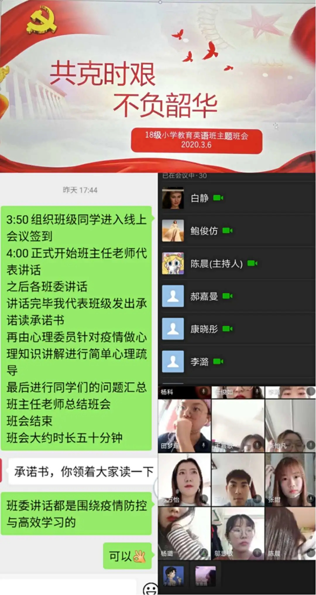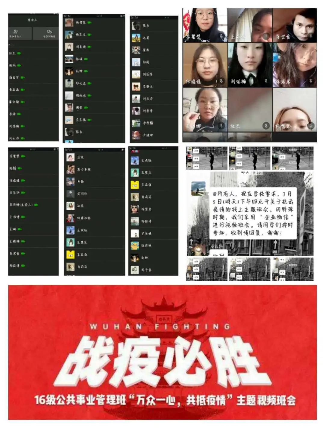 班会由各班班主任主持,充分利用企业微信、微信、QQ、钉钉等现代信息技术手段。班会内容主要围绕空中课堂我打卡、疫情防控我承诺、学霸养成我有招、生涯跨越任我行、排忧解难有我在五个方面展开,旨在按照“按期开课,延期返校”的原则,及时做好员工网络上课动员工作,明确网上教学安排和学习纪律,营造良好的网络学习学风;引导员工正确认识疫情 ,科学了解疫情;倡导员工严格遵守关于疫情防控的各项规定,每日定时在“健康情况日报系统”打卡,彰显当代老员工的责任与担当;激发员工们的学习积极性和主动性,共建团结和谐、健康向上的优良学风;就疫情当下毕业生面临的毕业论文答辩、考研复试、就业等问题,对毕业班员工进行深入细致的解答,开展精准指导服务;准确掌握班级员工思想动态、心理状况、学习生活情况,做好心理关怀。
