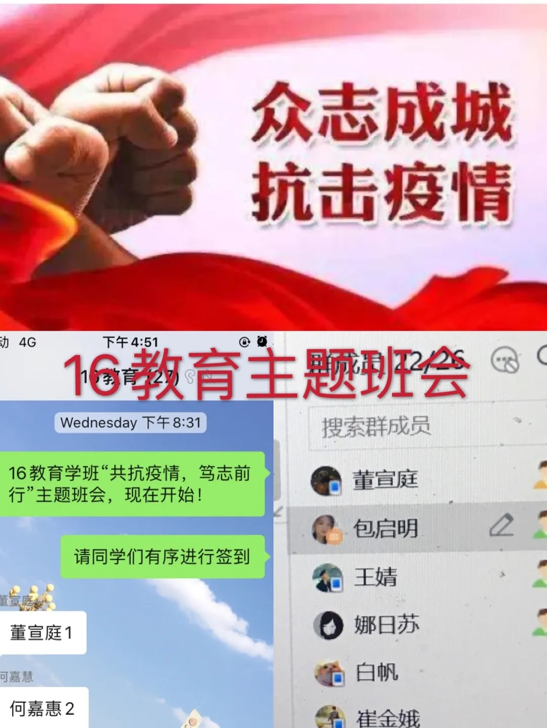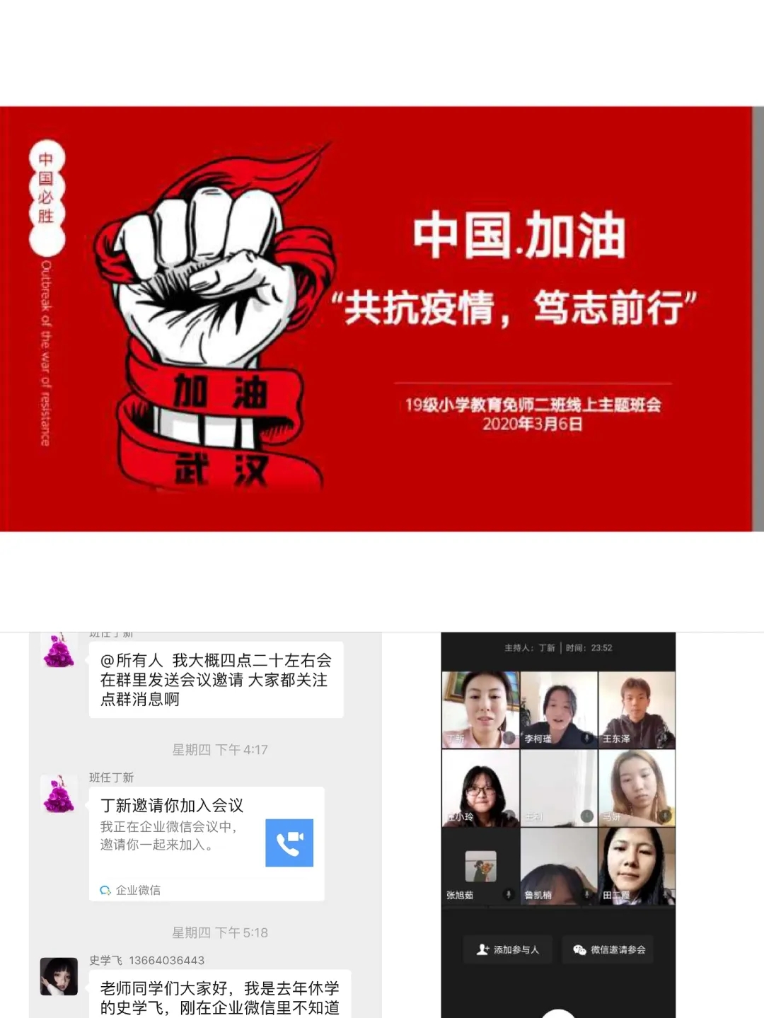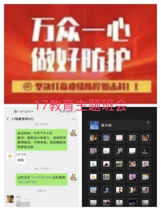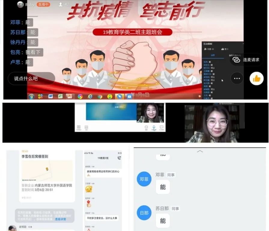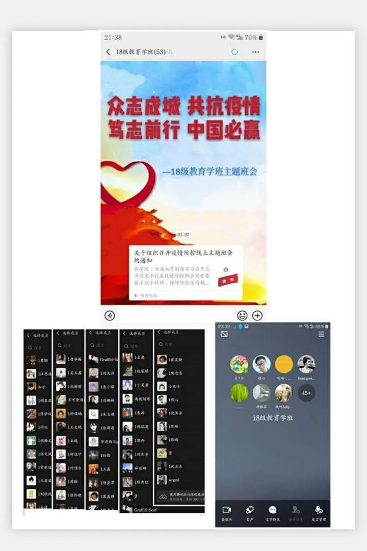 班会由各班班主任主持,充分利用企业微信、微信、QQ、钉钉等现代信息技术手段。班会内容主要围绕空中课堂我打卡、疫情防控我承诺、学霸养成我有招、生涯跨越任我行、排忧解难有我在五个方面展开,旨在按照“按期开课,延期返校”的原则,及时做好员工网络上课动员工作,明确网上教学安排和学习纪律,营造良好的网络学习学风;引导员工正确认识疫情 ,科学了解疫情;倡导员工严格遵守关于疫情防控的各项规定,每日定时在“健康情况日报系统”打卡,彰显当代老员工的责任与担当;激发员工们的学习积极性和主动性,共建团结和谐、健康向上的优良学风;就疫情当下毕业生面临的毕业论文答辩、考研复试、就业等问题,对毕业班员工进行深入细致的解答,开展精准指导服务;准确掌握班级员工思想动态、心理状况、学习生活情况,做好心理关怀。