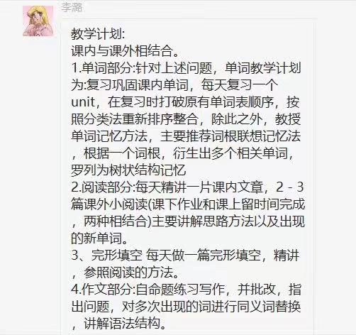 1.经初步了解,员工一英语基础较好,弱点集中在语法和写作方面。对此,我将教学重点放在基础语法以及写作训练方面,通过帮助员工构建课本知识框架,促进员工对史实的理解和辨别;同时,通过和员工一起研习练习题,加强员工基础语法知识学习。