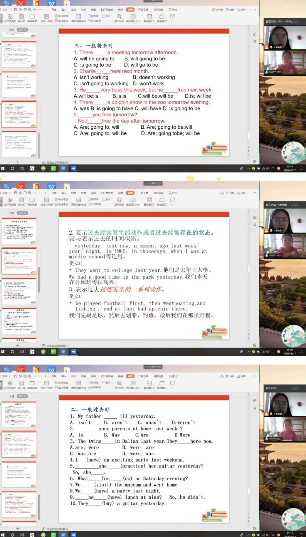 在上课前先复习了一般过去时动词的变化规律,廖同学掌握地较好,所以可以进入新内容的学习。新内容是一般过去时和一般将来时的知识讲解与习题练习。在一般过去时的知识部分,廖同学理解地较好,但对过去时的否定句、一般疑问句变化还是稍微有些困惑,所以我在讲完知识点后配套了相应的习题。在经过练习后,廖同学对过去时及其句型变化有了较好的掌握。在一般将来时部分,廖同学刚开始不太明白其结构组成,通过后来的知识讲解以及习题练习,她对一般将来时的应用也有了更好地理解。通过两节课的学习,廖同学对英语时态知识的理解也逐渐深入,我在课后也留下相应的习题希望她可以将知识合理运用。
