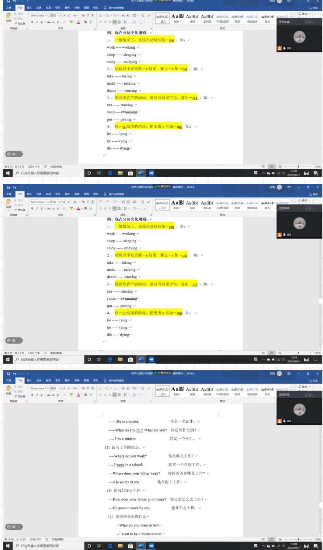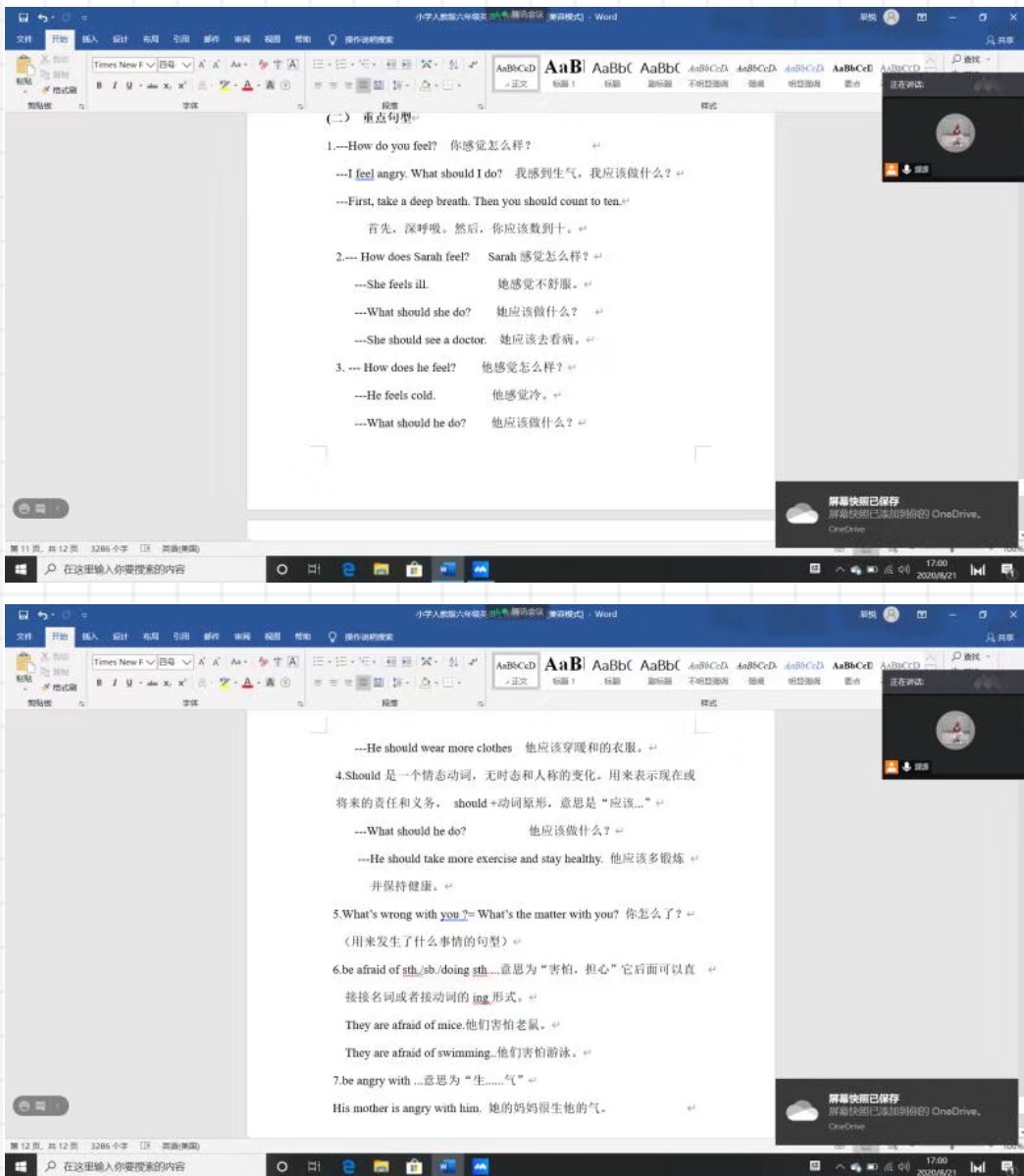 今天是最后一节课,继续复习六年级上册剩下的三个单元的单词和知识。今日重点是动词三单的变化形式和现在分词的变化形式、询问职业和工作地点、询问感受以及给出建议、afraid with 和angry with的用法。通过与同学对话,能感受到廖同学经过10天的学习,敢说敢表达,对于基础知识的记忆和理解也更准确,能够举一反三和抢答问题了,这令我和廖同学非常开心。在结束本节课的内容后,我进行了一个短暂的回访,同学对我们的讲解表示很满意,也很认可我们的工作,我们也给予她祝福和期望,希望她能够把英语学习的更扎实,取得令自己满意的分数。