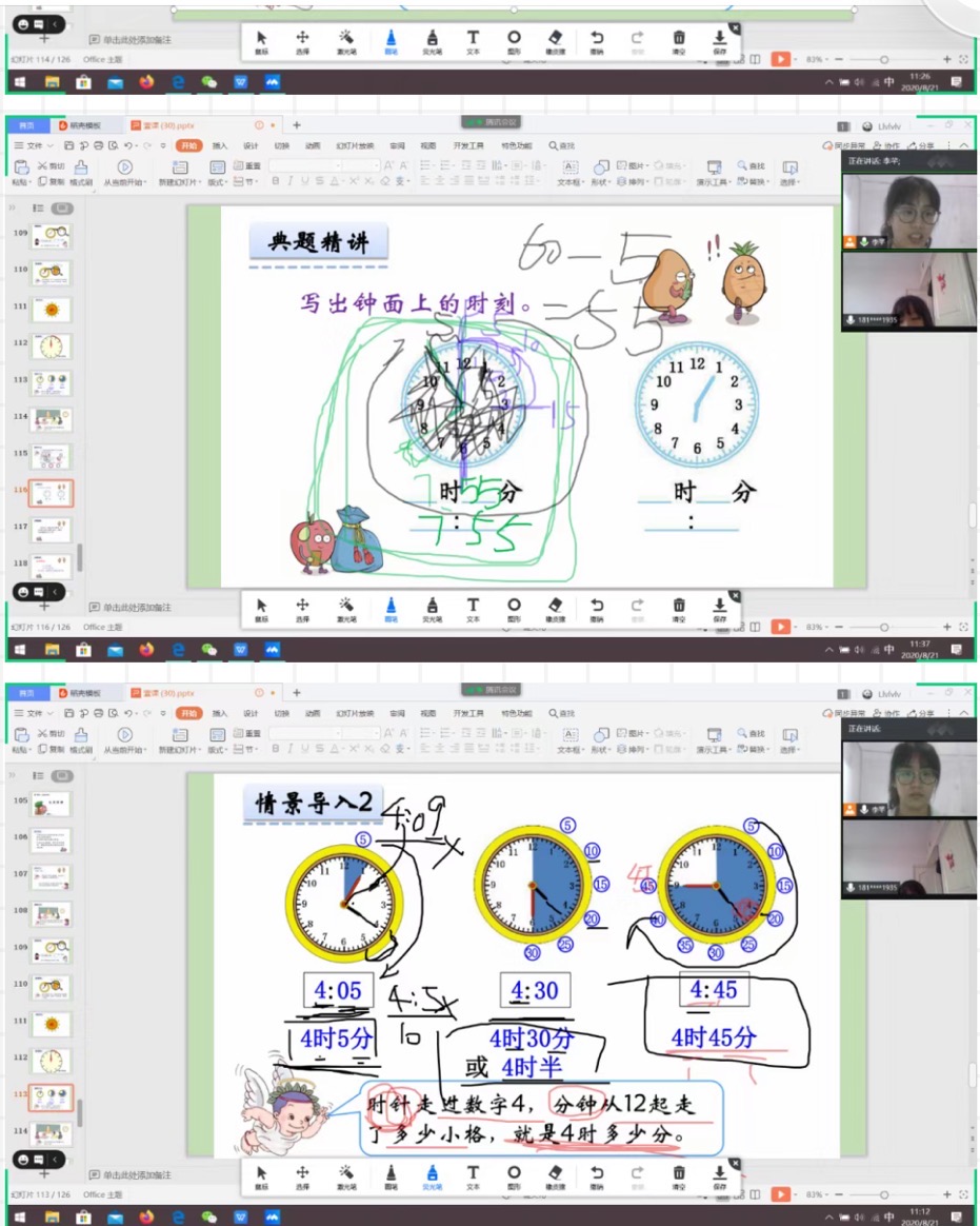 今天的学习主题是“认识时间”,学习目标是:①建立时和分的时间观念,认识时和分,会进行换算;②学会几时几分表达时间;③结合生活经验,解决时间问题时,掌握时间的先后顺序和时间的长短。课前,我在和小廖同学的交流之中了解到,小廖同学在幼儿园时期,学习过在时钟上认识整点的时间。但是今天的上课过程并不是太顺利,在上课的一个小时之中,小廖同学对今天的知识似乎并没有完全理解,在这个过程之中我也有些许着急。于是在本次课的最后留了一点时间,和小廖同学进行了交流和沟通,一起寻找和分析了原因。并且最后在征得小廖同学的意见之后,共同决定了明天最后一次课的上课内容。
