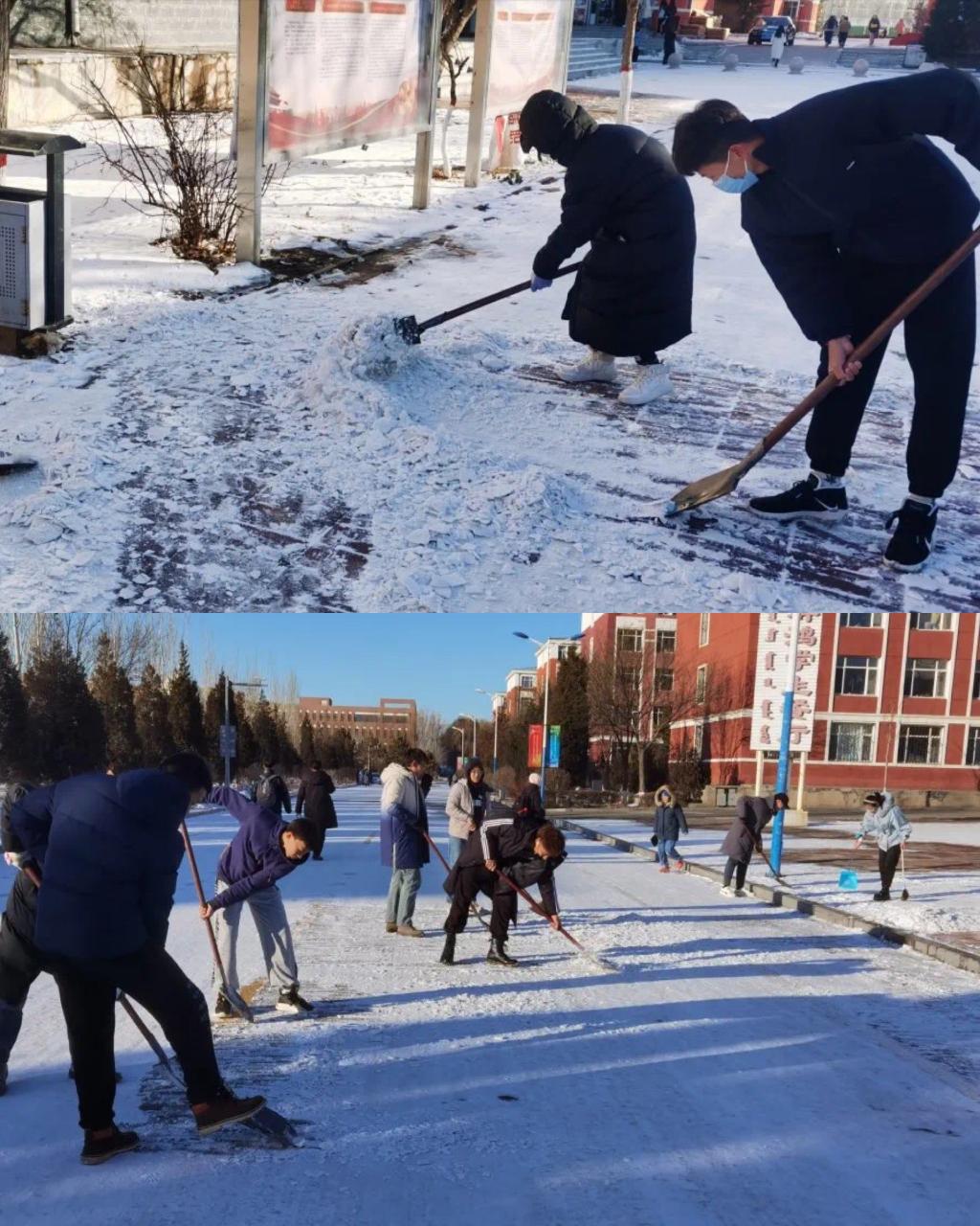 2020年11月21日,一场冬雪让师大的校园内银装素裹,分外美丽。为确保师生校园内交通安全,出行畅通,11月22日,必一运动组织2020级各班员工及员工会成员对群鸿餐厅周围积雪进行清扫。