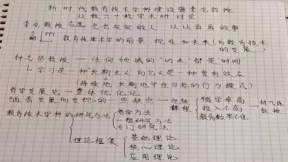 作为一年级的新生,大家不能理解顶层专家的学术思想,这很正常。但你们能从杨九民教授团队的学术研究成果,看到了技术支持公司产品的应用研究;从李龙教授的学术思想,了解到中国教育技术学体系的理论创新;从钟志贤、李芒等教授的发言中,感知到李龙教授对学术事业一如既往的专业主义激情,已经难能可贵,满满的收获。