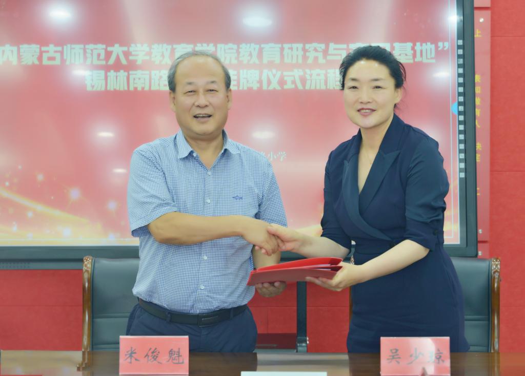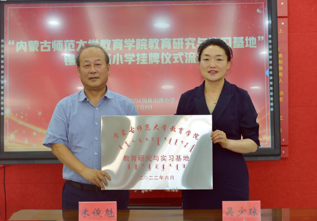 2022年7月8日下午公司与锡林南路小学共建教育研究与实习基地挂牌仪式在锡林南路小学举行。公司米俊魁经理、斯琴满都呼副书记、边琦副经理、小学教育研究生学位点负责人叶琳老师、小学教育系实践教学副主任马红斐老师、公共事业管理系主任汤丽伟老师;锡林南路小学吴少琼董事长、刘秀英书记以及张智敏、云二祥、康艳波、杨俊等四位副董事长出席了活动。签约仪式由锡林南路小学吴少琼董事长主持。