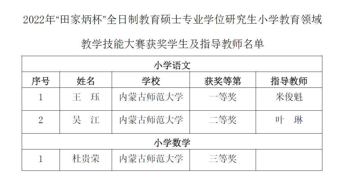近日,由江苏师范大学组织承办的2022年“田家炳杯”全日制教育硕士专业学位研究生小学教育领域教学技能大赛获奖结果公布。