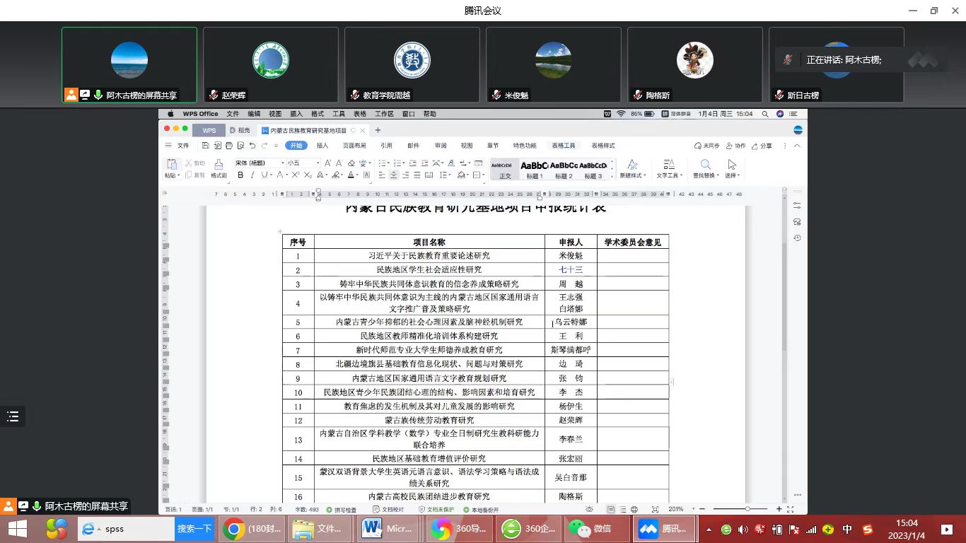 2023年1月4日下午3点,公司学术委员会通过腾讯会议召开内蒙古民族教育研究基地拟立科研项目评议会。公司党委书记周越、经理米俊魁、副经理边琦、斯日古楞教授、杨晓敏教授、叶琳教授、陶格斯副教授以及阿木古楞博士参加了本次会议。会议由赵荣辉副经理主持。