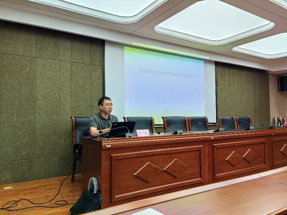 8月27日上午,广西师范大学教育学部副部长、博士生导师李广海教授应公司邀请,对公司教师进行课程目标达成度计算专项培训。李广海教授兼任中国教育战略发展学会教育法治专业委员会常务理事、中国成人教育协会教师教育培训专业委员会副理事长、中国学前教育研究会学前教育管理专委会委员、广西教育政策与法治研究专业委员会秘书长。培训会由杨日飞副经理主持。经理赵荣辉、副经理边琦、系部主任、各系专任教师以及来自心理公司、历史文化公司等50多名教师参加了培训学习。