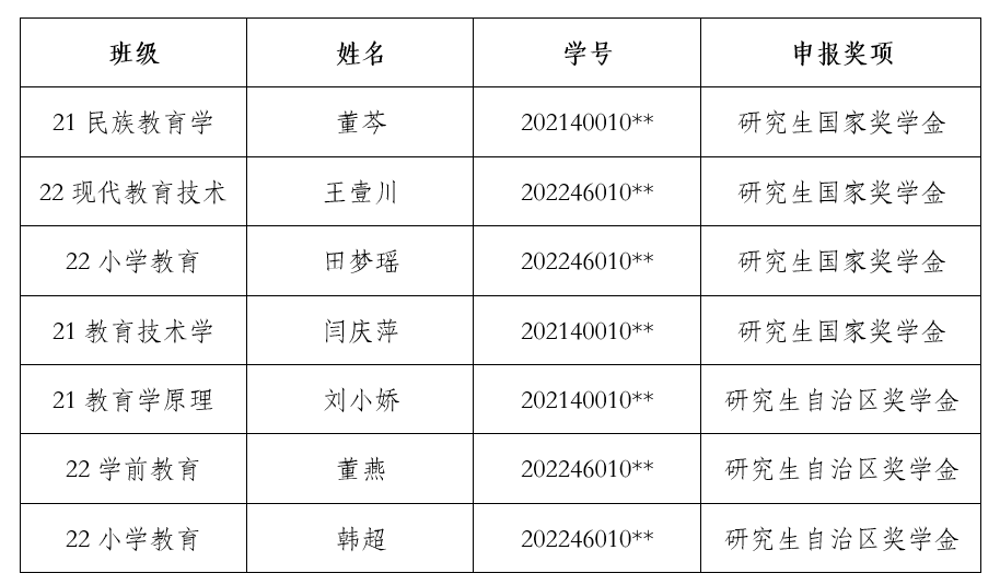 依据《必一运动官网研究生奖学金评选办法》(校发[2022]54号)和《关于做好2023年度研究生各类奖学金评审及材料报送工作的通知》文件精神,经过员工申请、班级推荐以及公司公开答辩,拟推荐以下员工分别申报研究生国家奖学金和研究生自治区奖学金。